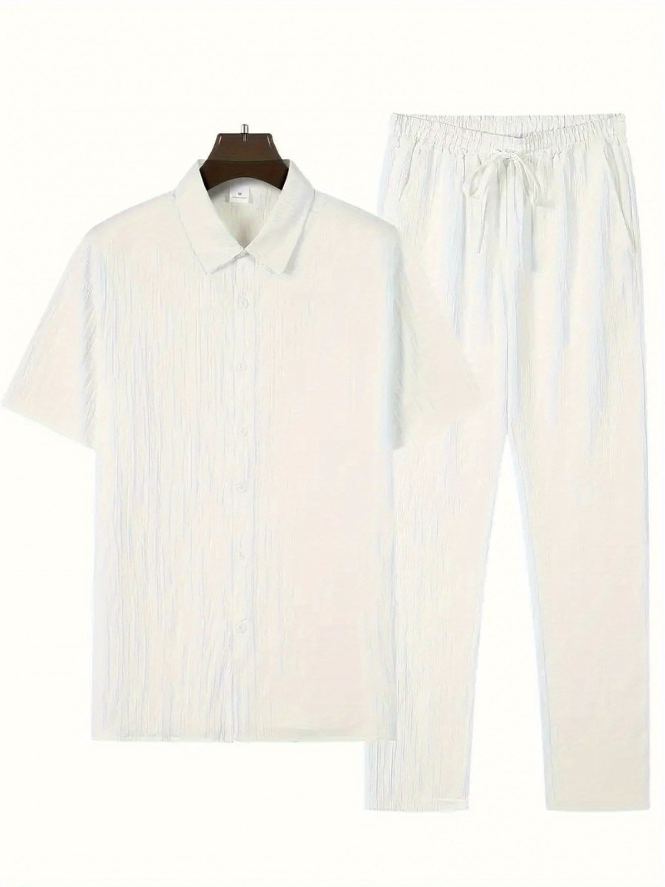 MenCasual Stripes Short Sleeve Sports Suit, Button Shirt Collar and Elastic Waistband Pants, Made of Polyester Textile Elastic Fiber Blend, SummerTwo-Piece Set, Belt Detail