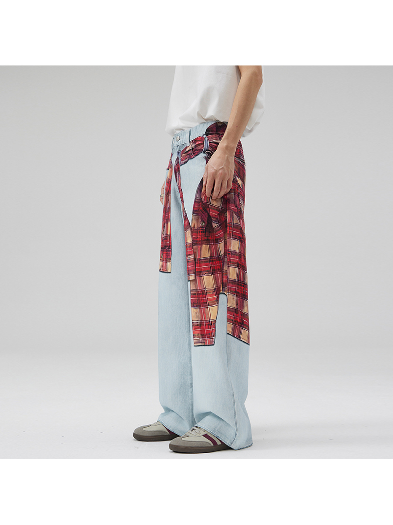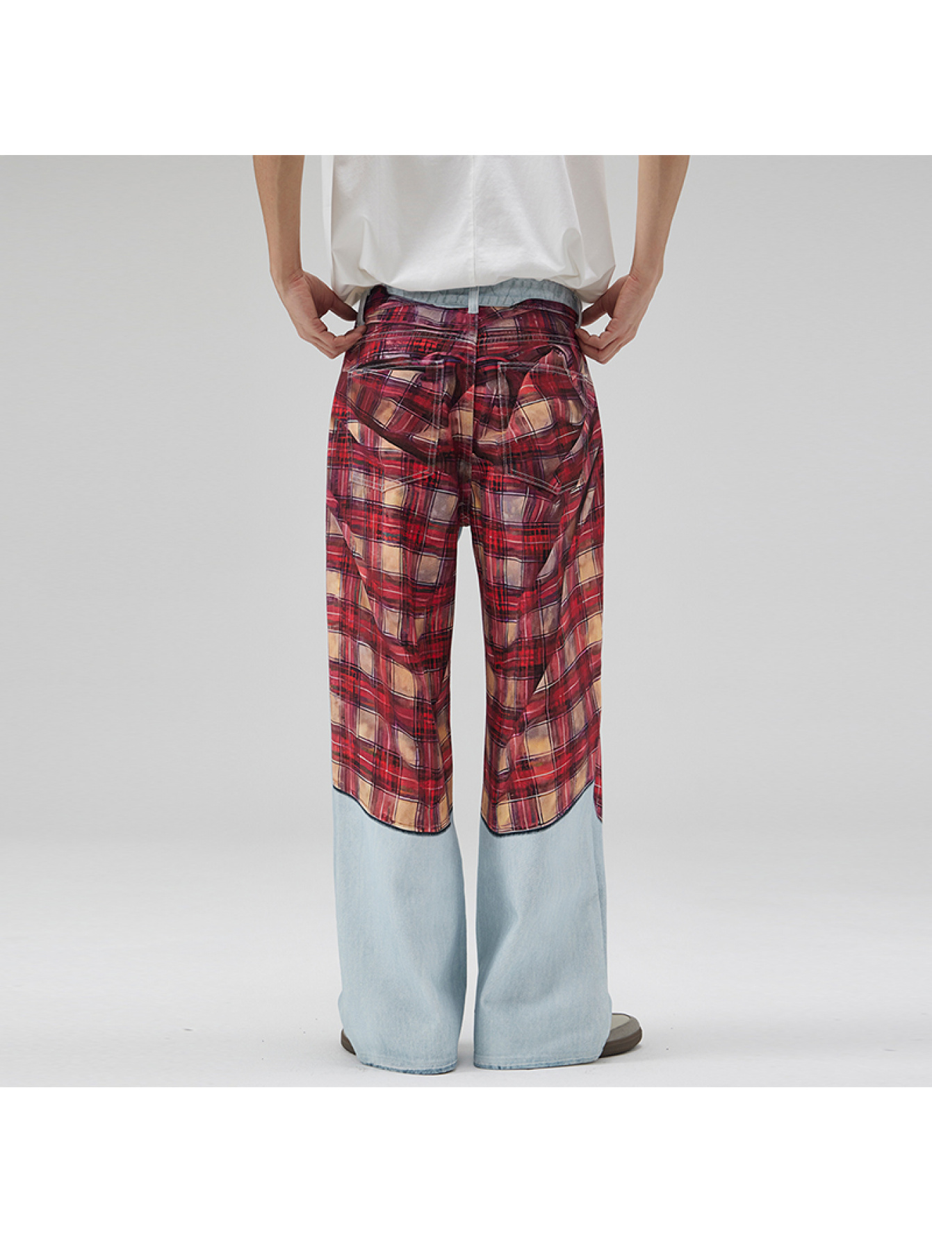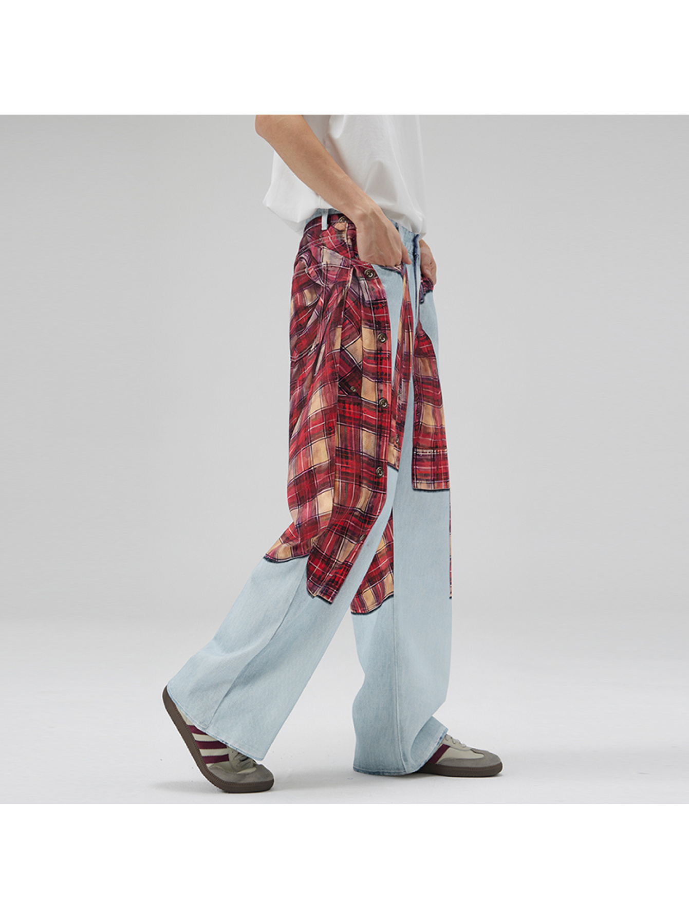 Men’S Casual Plaid Shirt & Straight-Leg Faux Denim – 3D Digital Print, Light Wash, Loose Fit, A-Line Design, All-Season Comfort, Regular Length, Perfect for Casual Attire, Comfortable Clothing | Relaxed Fit Pants | Digital Print Shirt