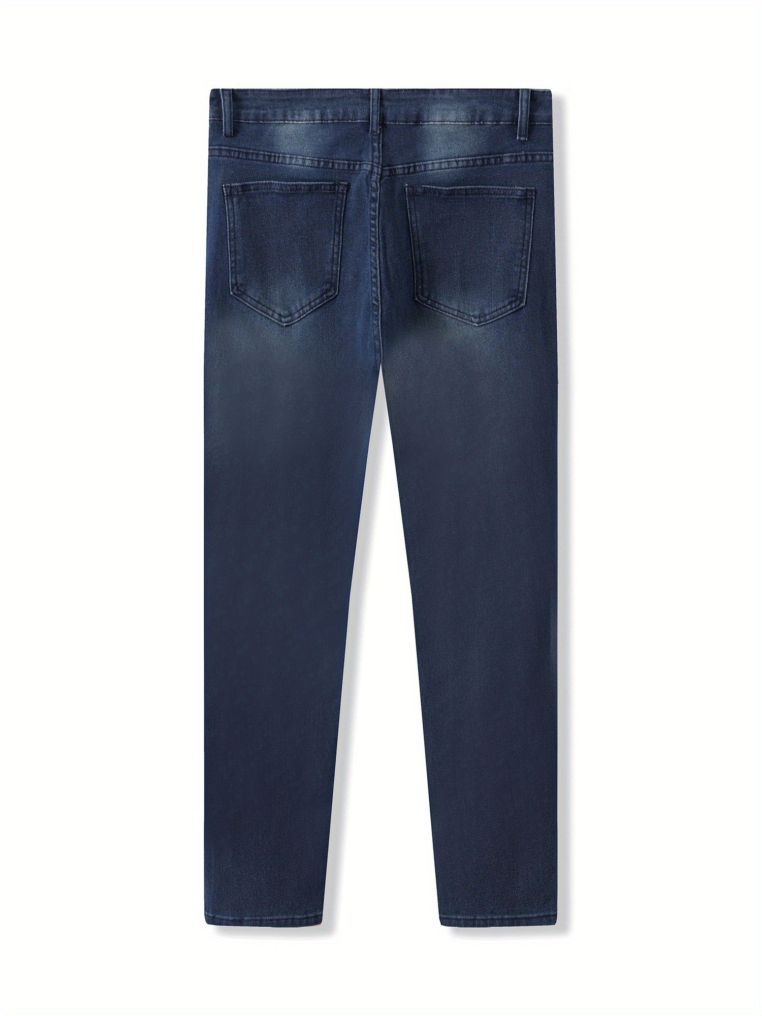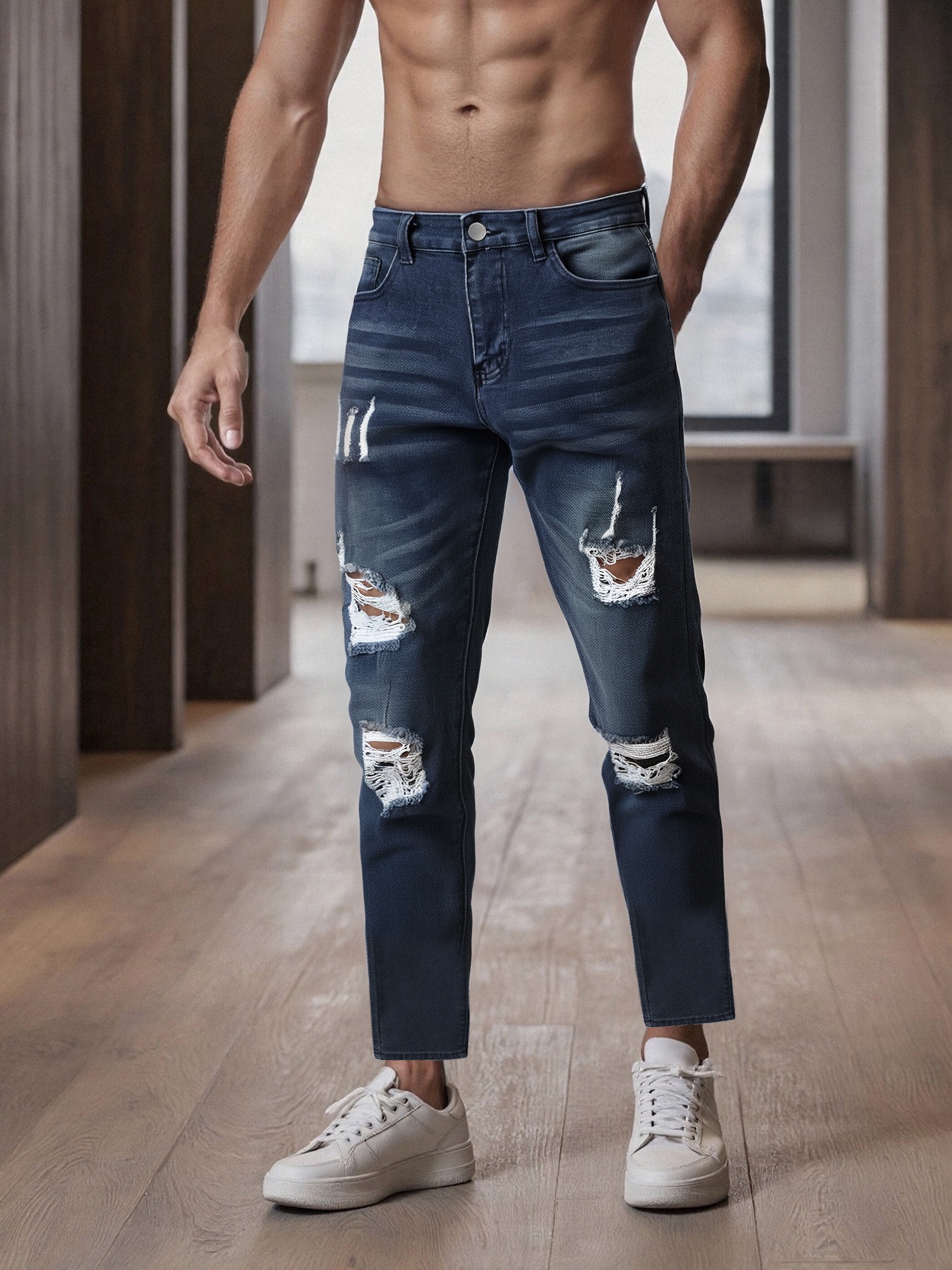Men’s Skinny High-Waisted Stretch Denim Jeans – Lightweight Ripped Distressed Blue Washed Pants with White Torn Details, All-Season Casual Streetwear Trousers for Men, Machine Washable Slim Fit Jeans