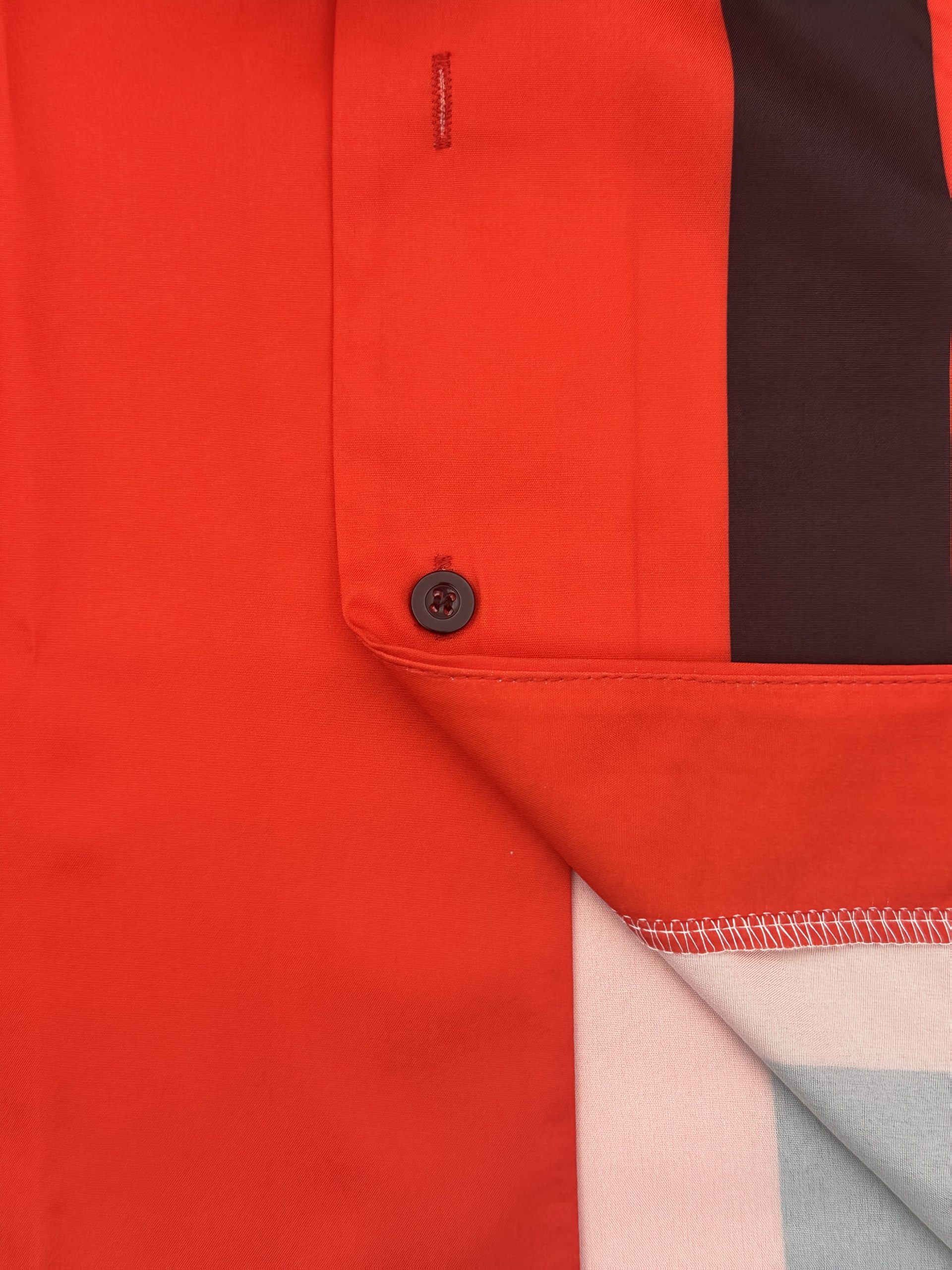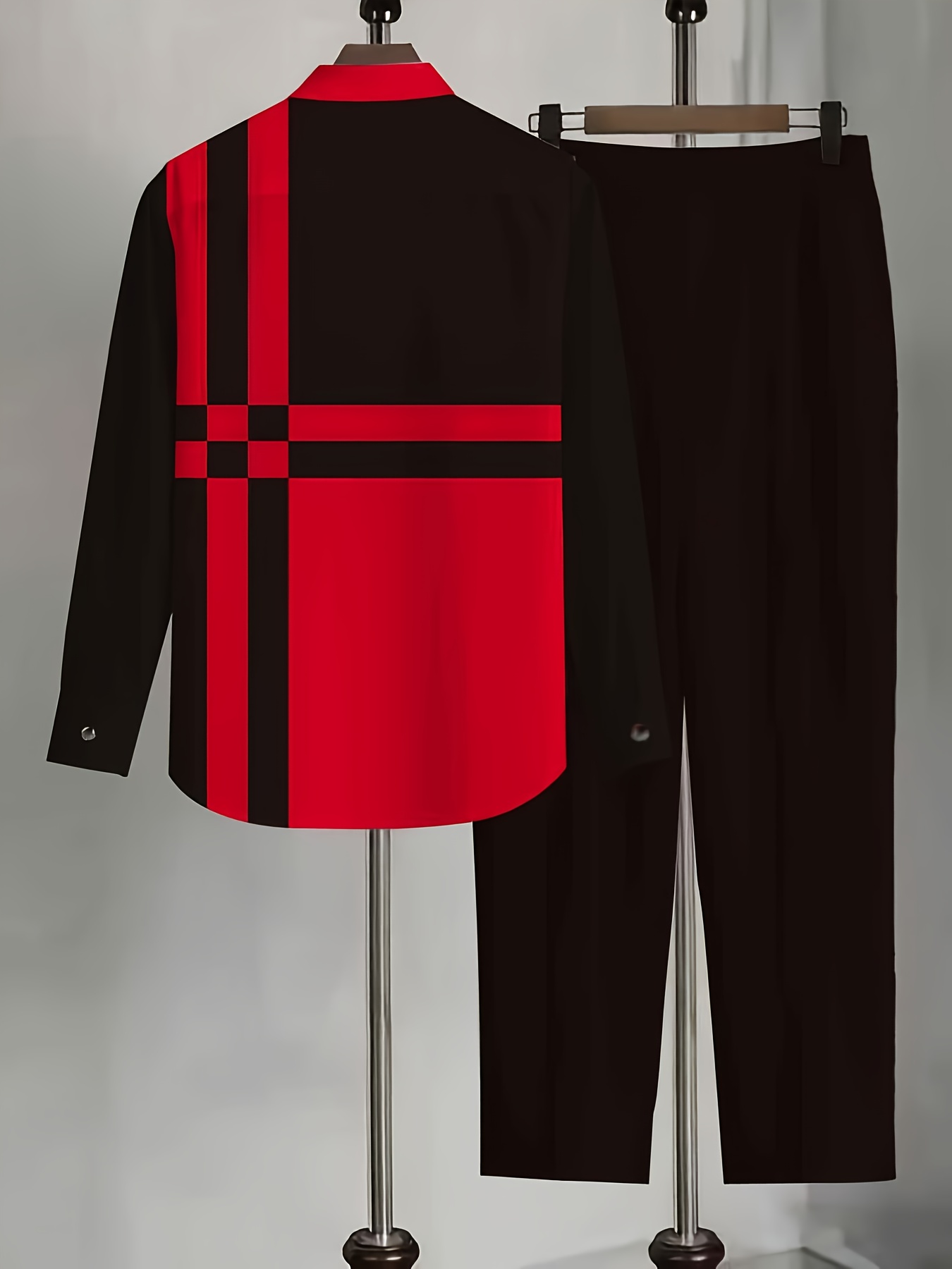 New products in 2025, a two-piece set consisting of a simple Cuban collar long-sleeved Men’s shirt and long pants. The set features an artistic black and red color-blocking style, suitable for casual wear, vacations, and daily outings.