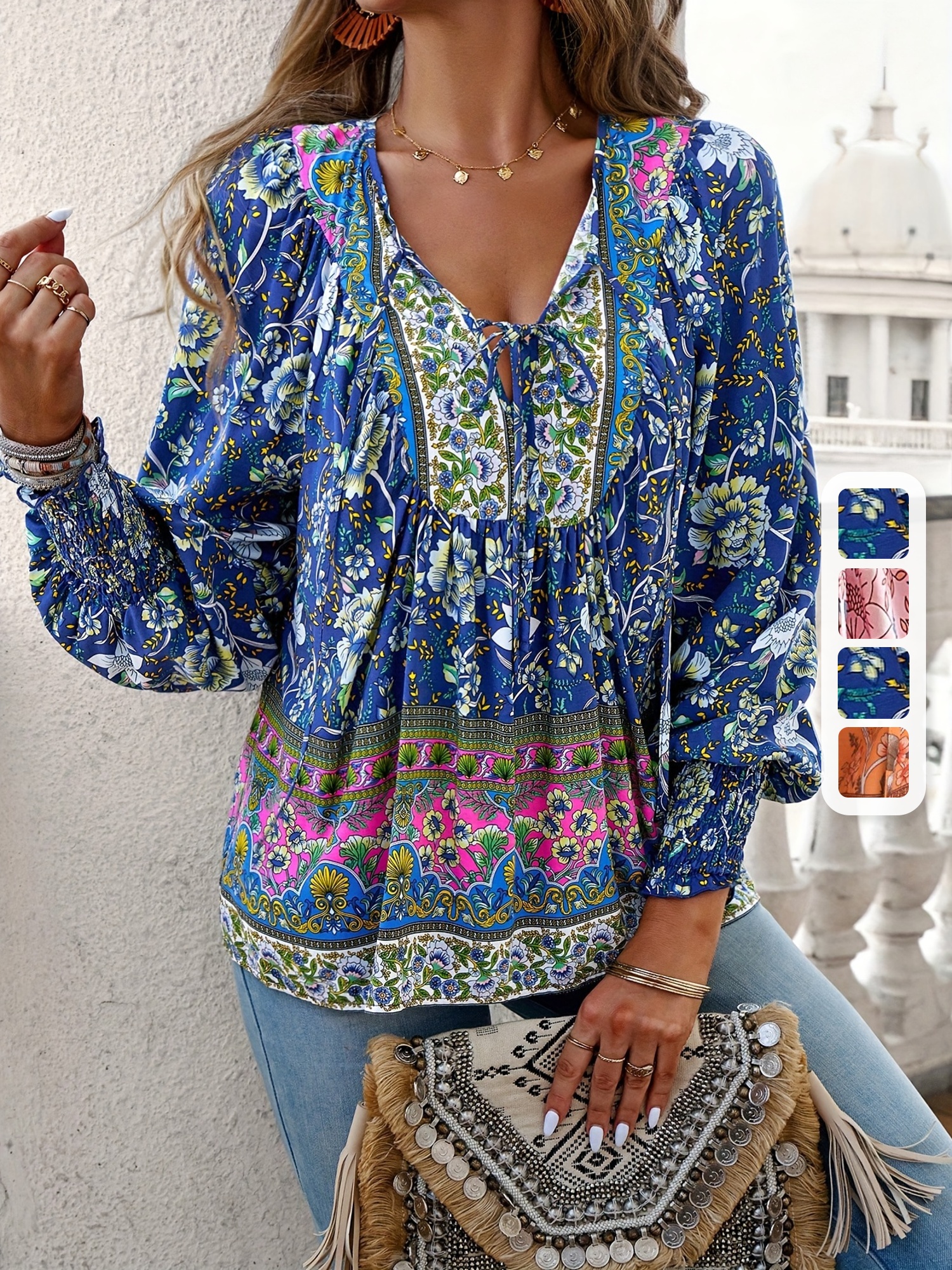 Vibrant Bohemian Floral Print V Neck Blouse For Women – Chic Long Sleeve Relaxed Fit Clothing For All Seasons – Perfect For Casual Daily Wear, Outdoor Activities & Vacations