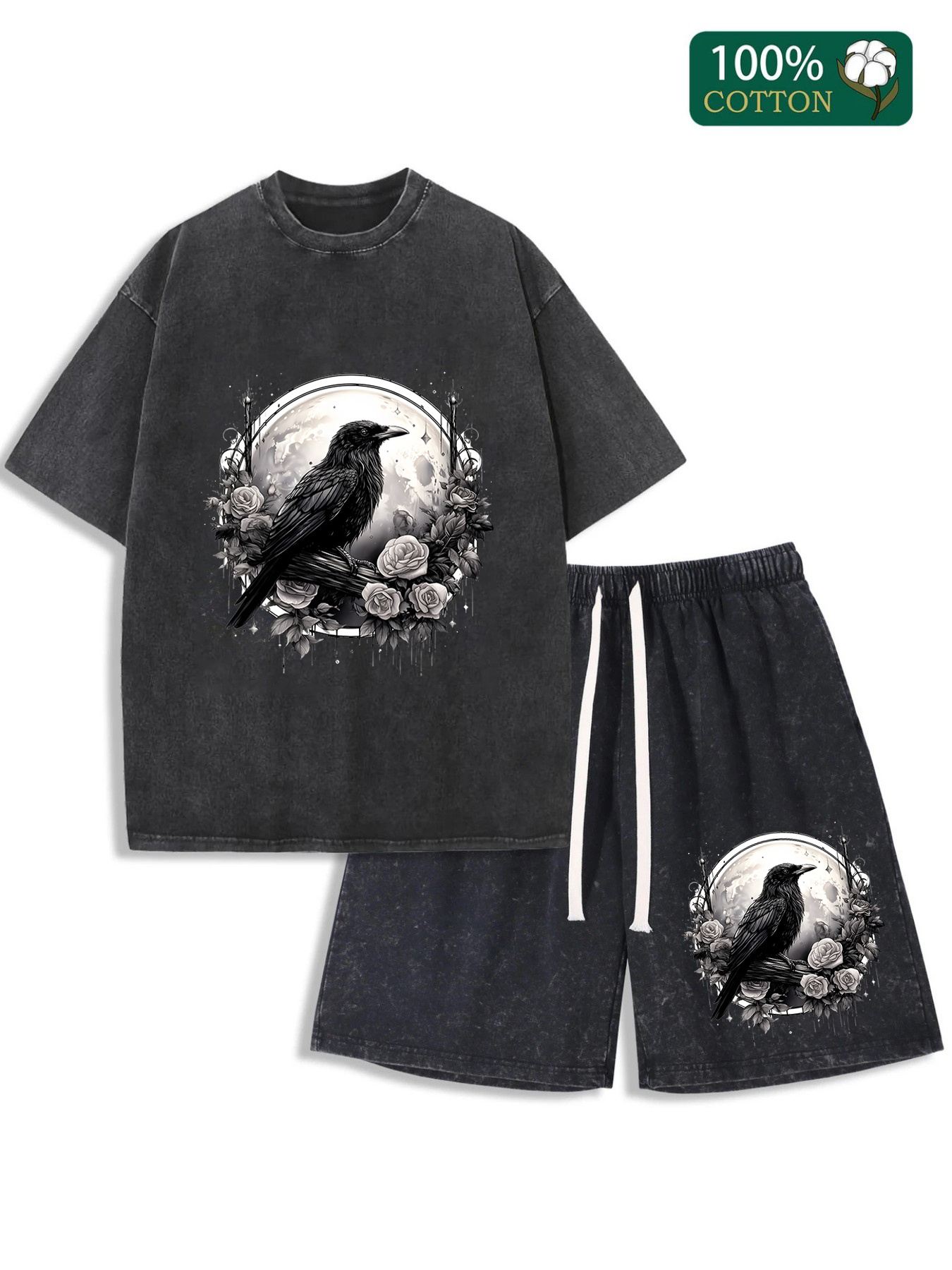 Be the first to review “Washed vintage batik cotton, paired with 230GT shirt and 290G shorts, recent bestseller, washed set with flowers and crows printed on it, outdoor adventure travel on the street” Cancel reply