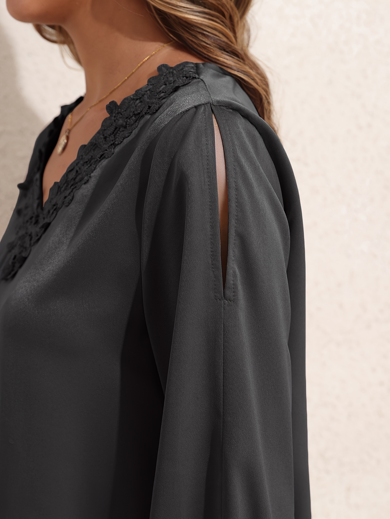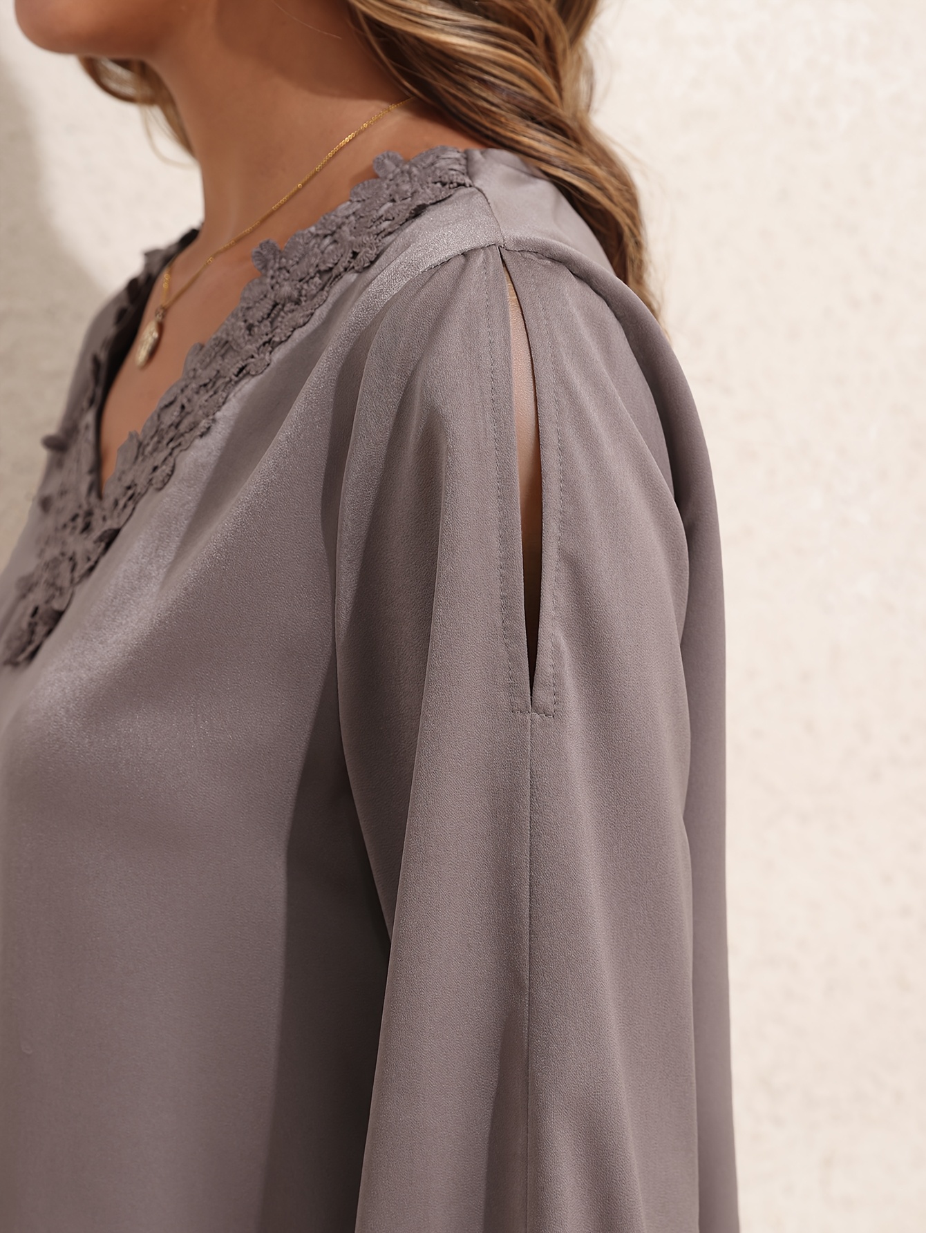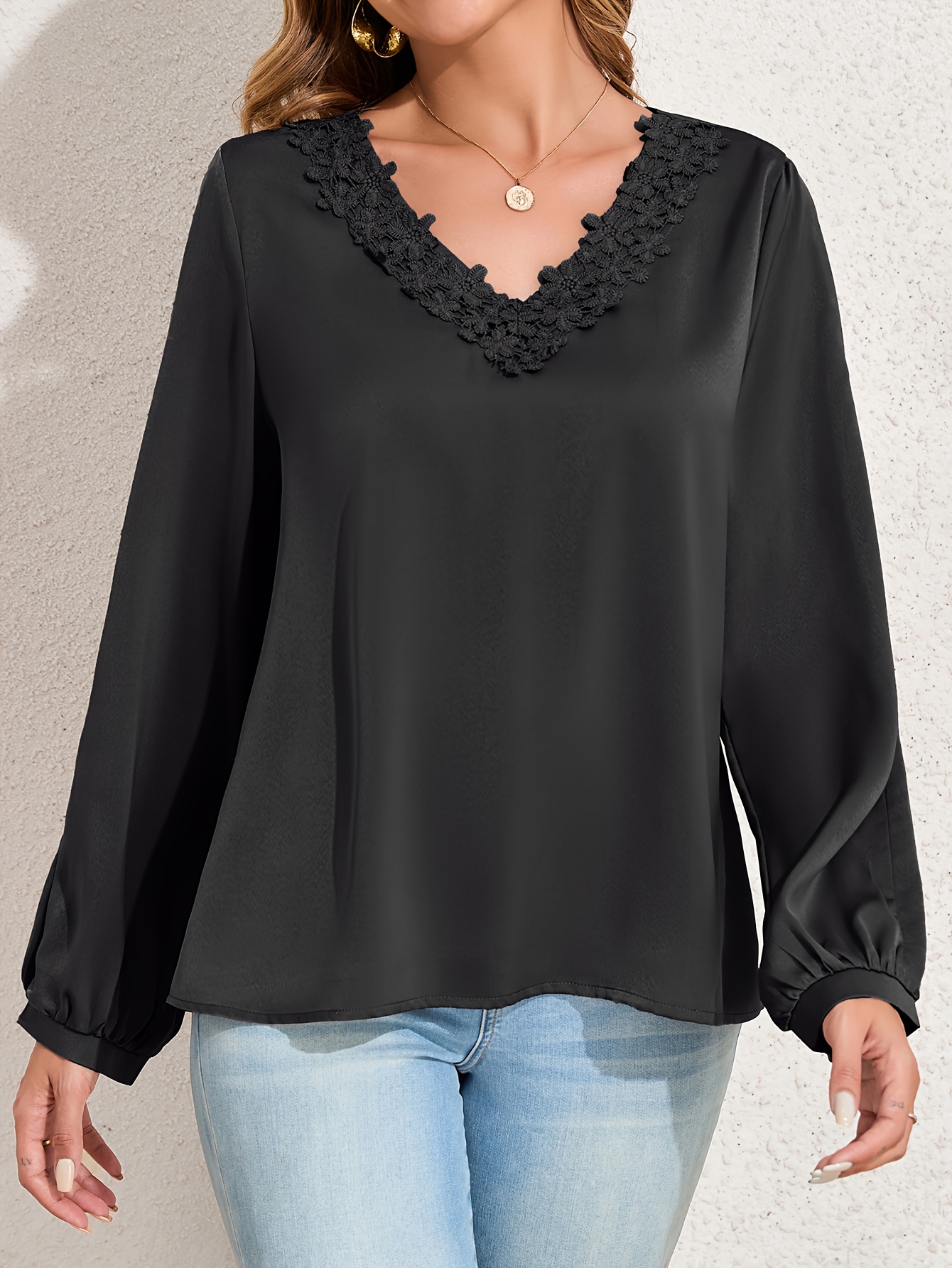 Women Summer Tops Neckline Lace Patchwork Pullover Shirt Long Sleeve Elegant Blouse