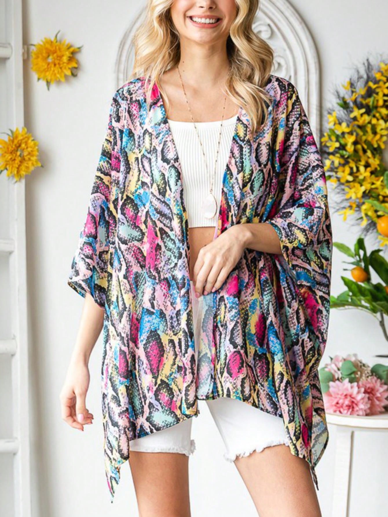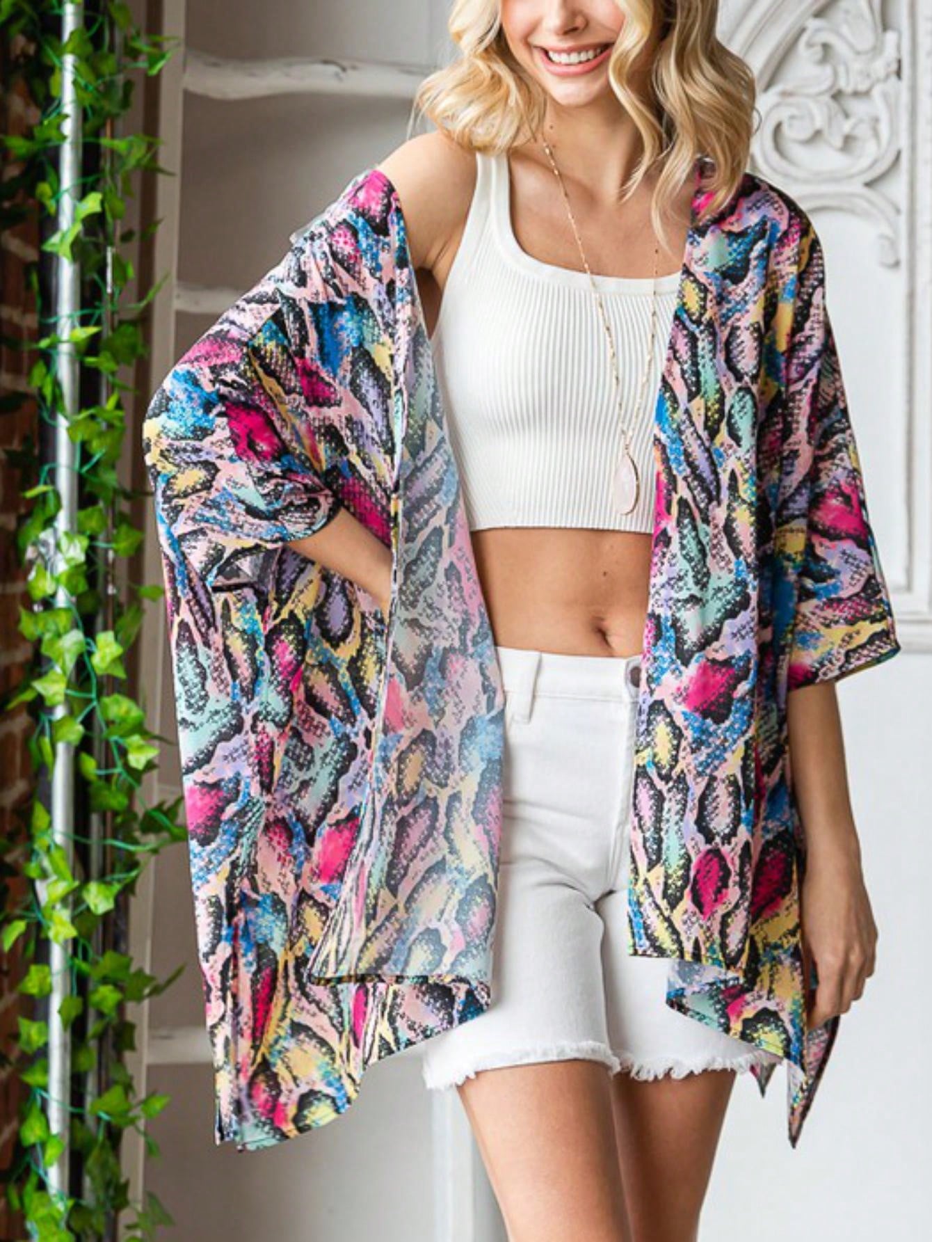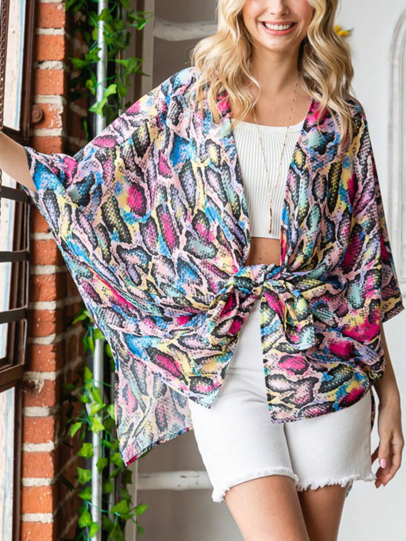 A multi-color snake open cardigan is a unique piece that adds a touch of edginess to your outfit. The snake print design brings a bold and stylish element to the cardigan. perfect for making a statement. This cardigan can be worn with simple basics to let the print stand out or paired with solid-colored pieces for a chic and modern look.