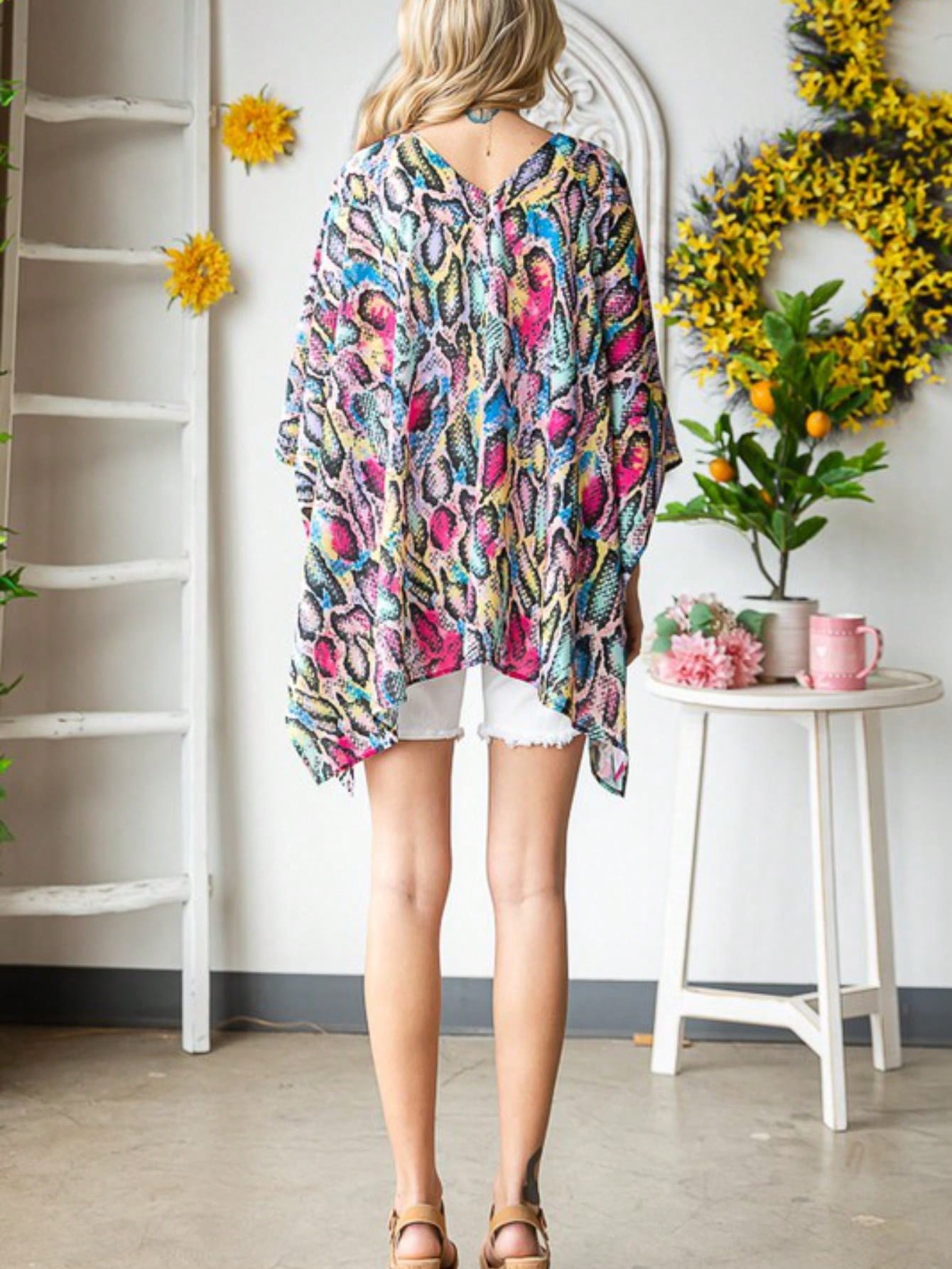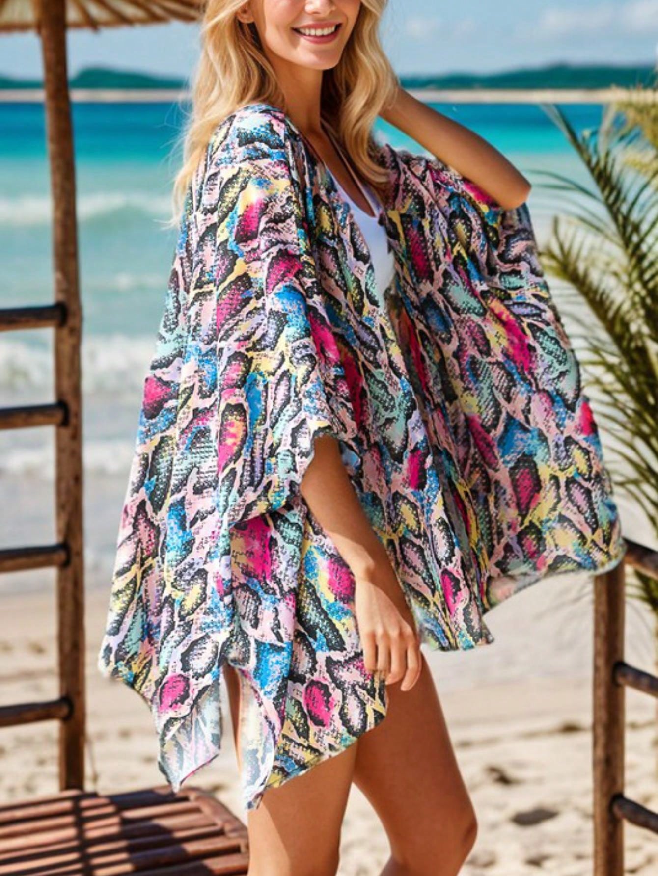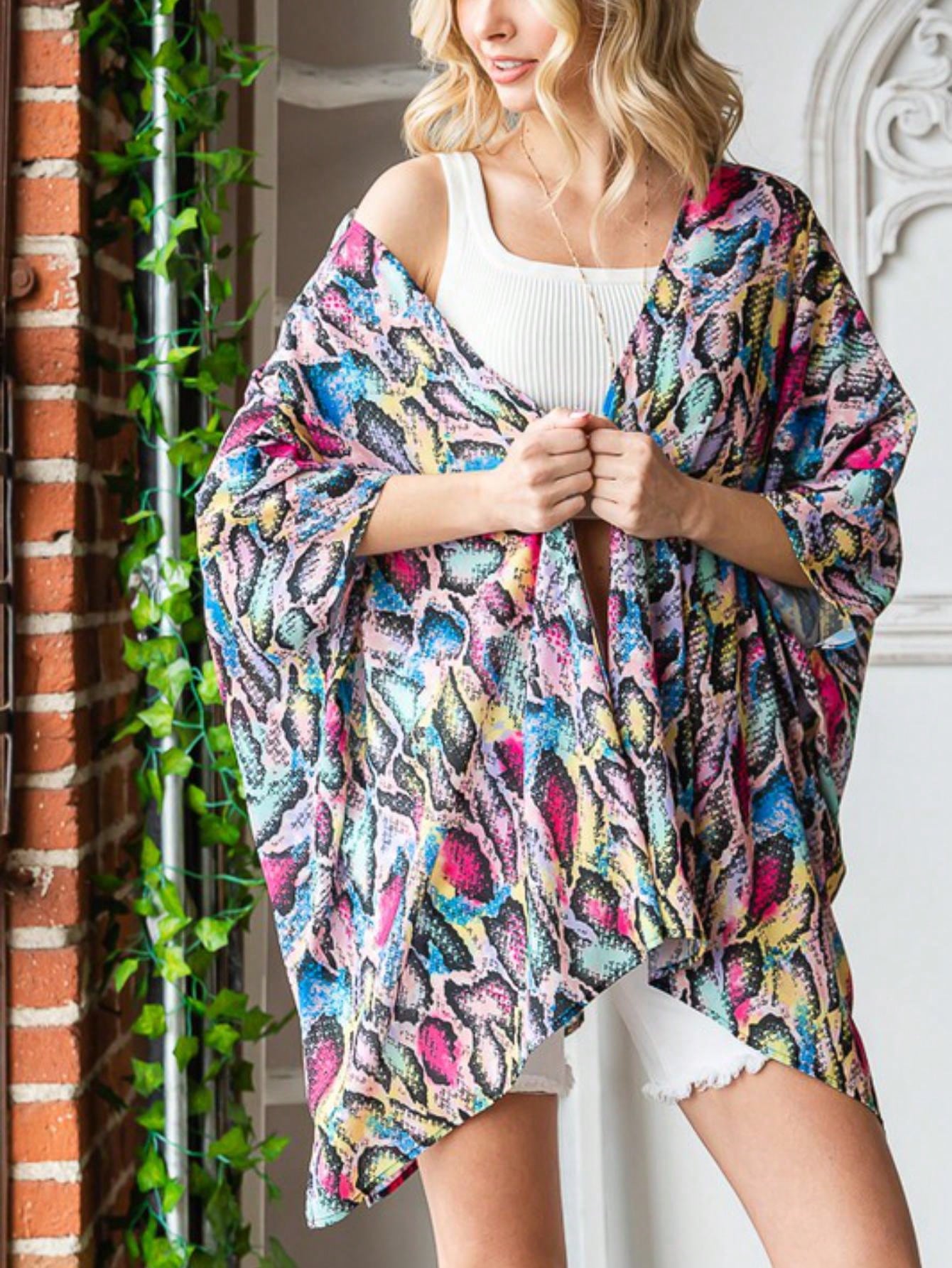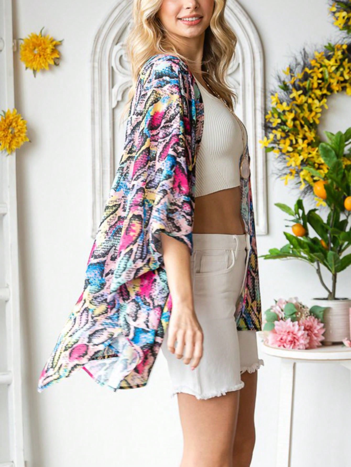 A multi-color snake open cardigan is a unique piece that adds a touch of edginess to your outfit. The snake print design brings a bold and stylish element to the cardigan. perfect for making a statement. This cardigan can be worn with simple basics to let the print stand out or paired with solid-colored pieces for a chic and modern look.
