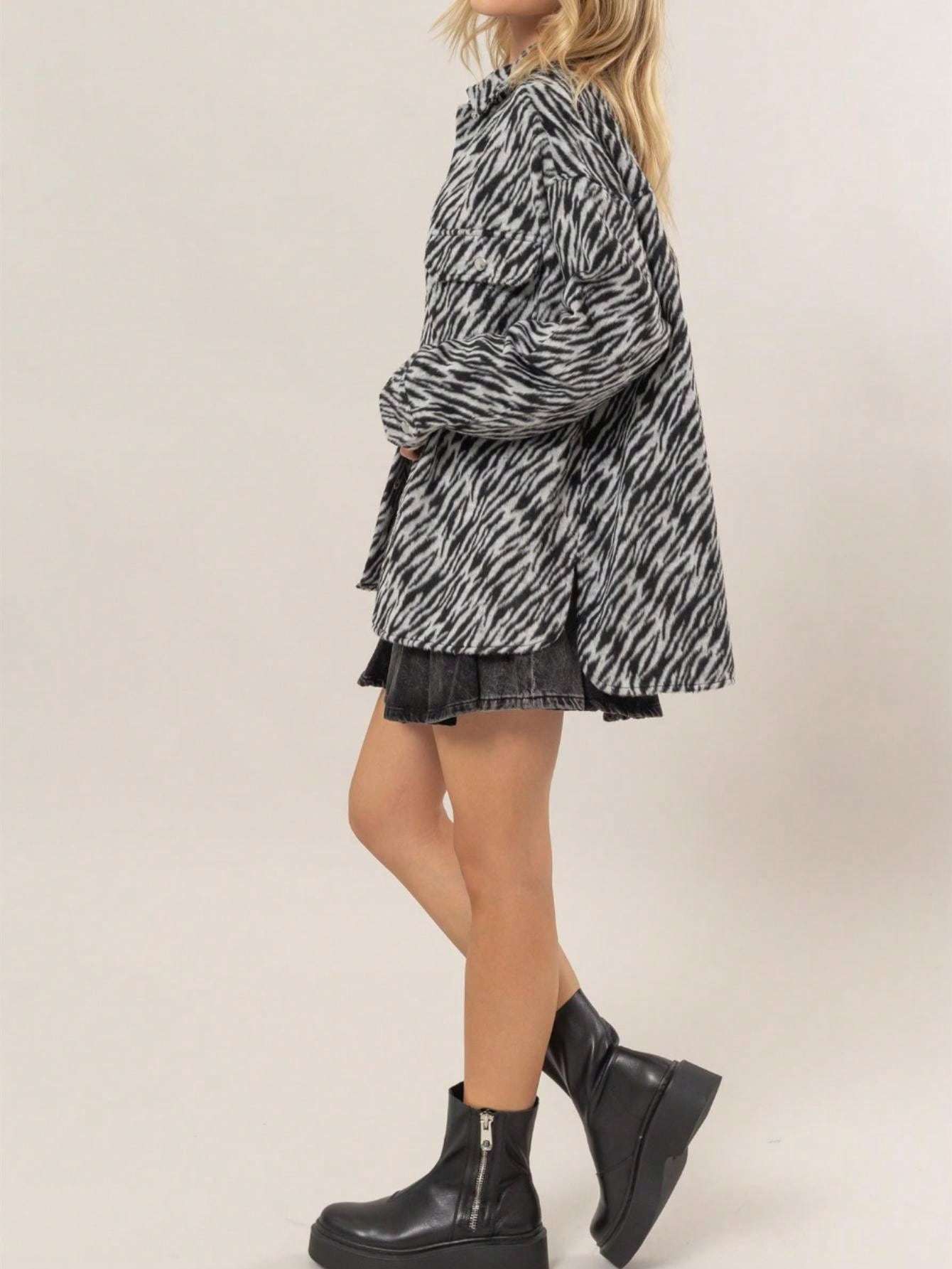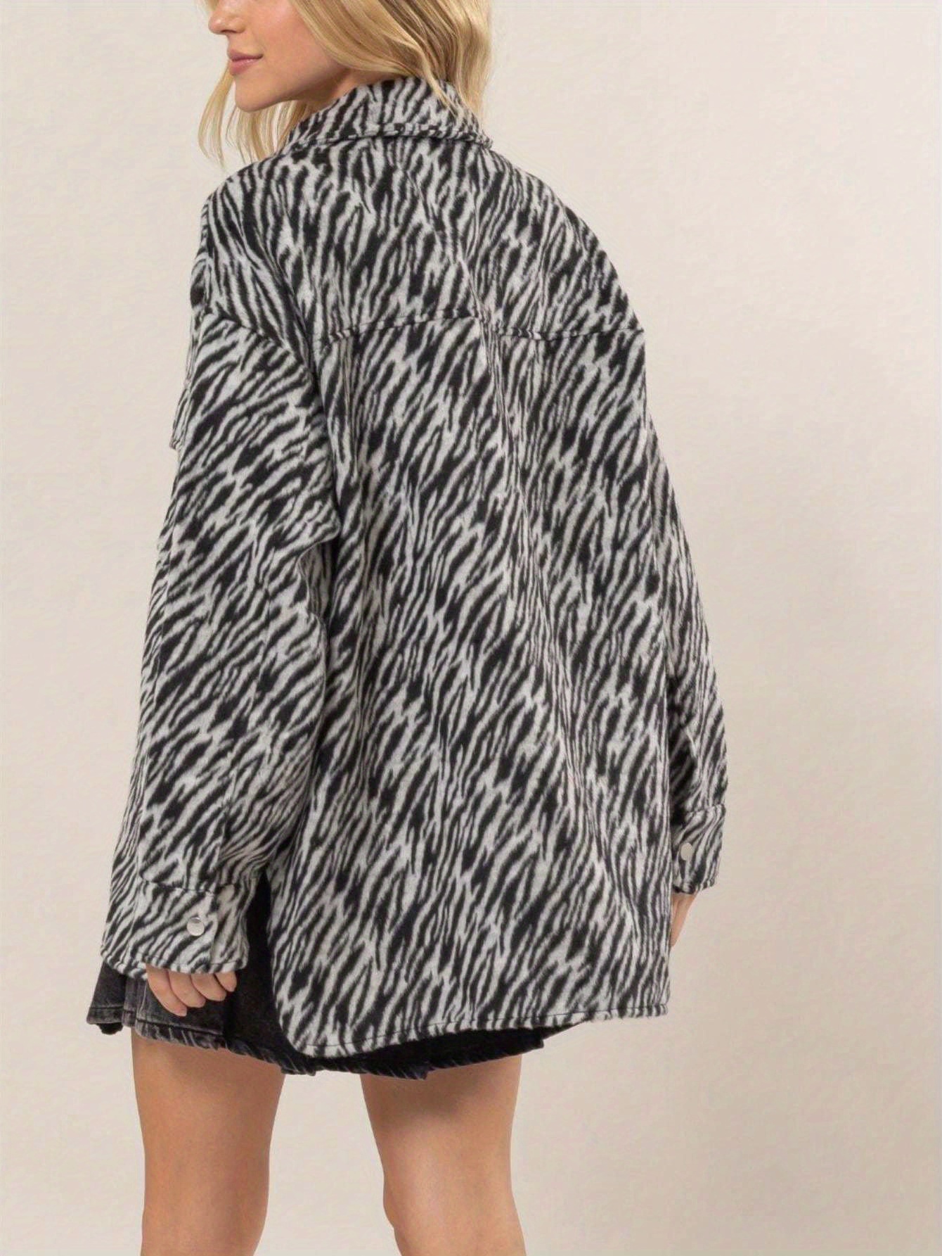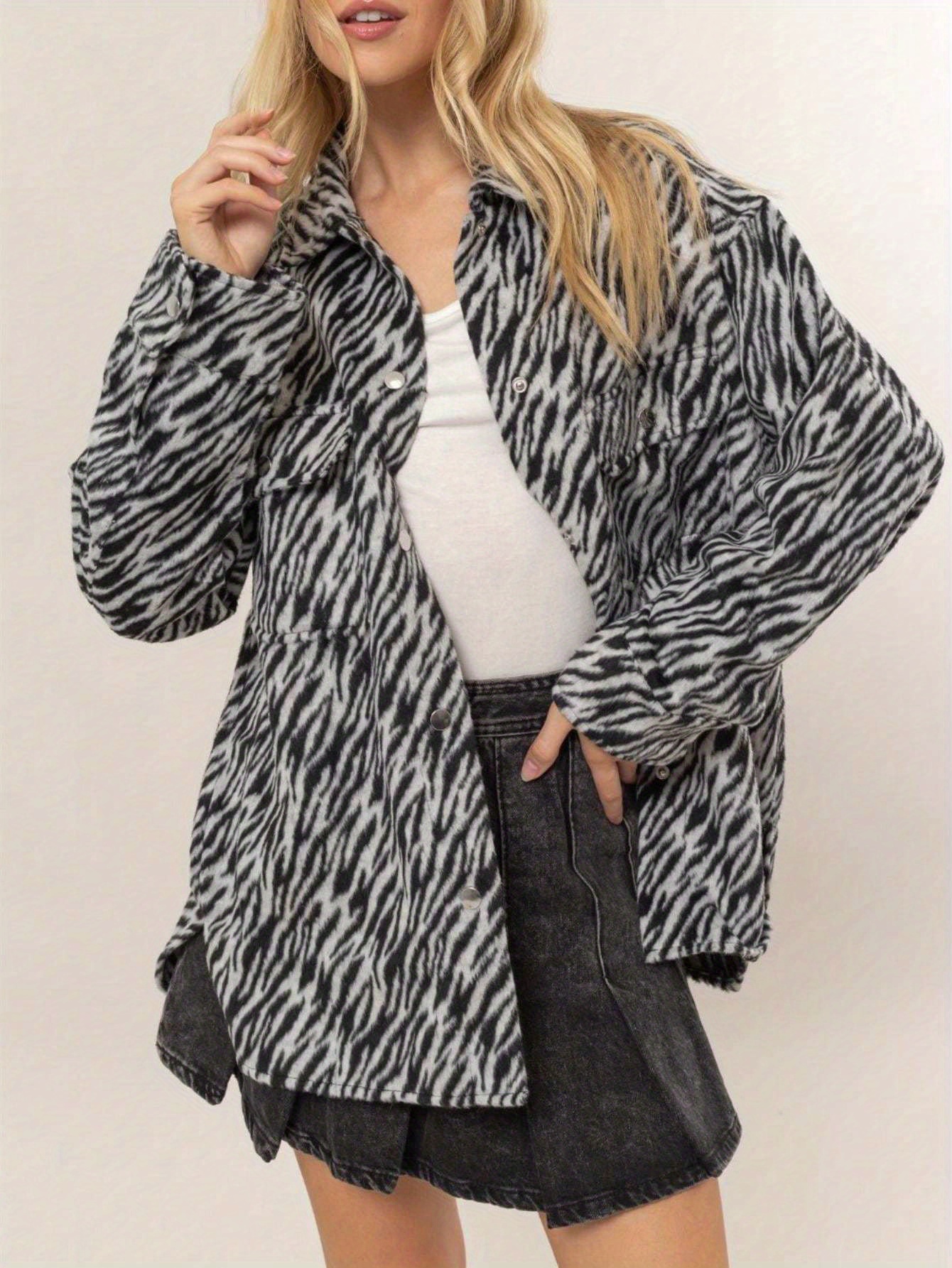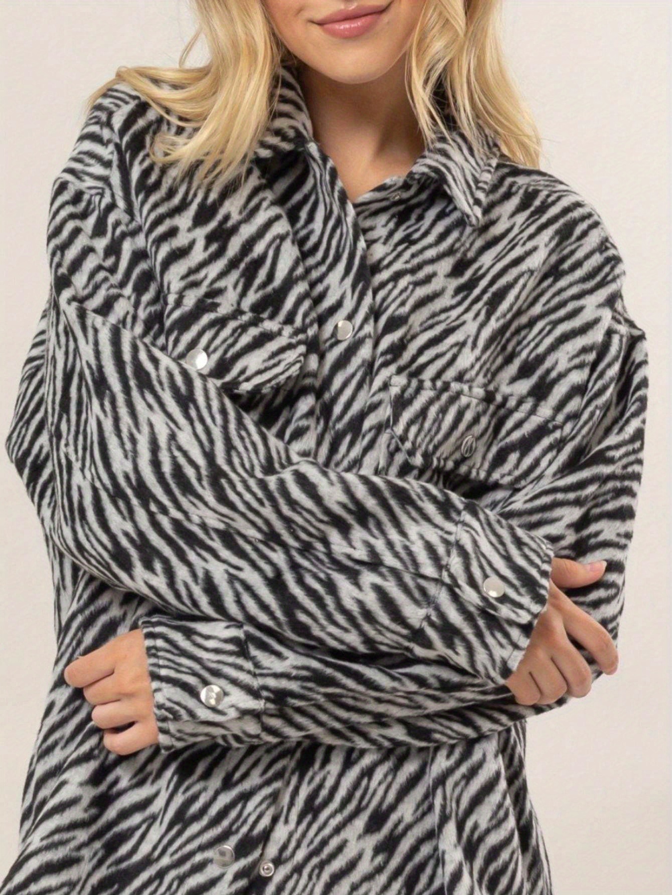 Women’S Casual Jacket Chic Zebra Print Snap Outerwear Top Camel Polyester Blend Long Sleeve with Button-Up Closure, Oversized Fit Collared Neck Hip-Length Perfect for Fallu002F Winter Layered Street Style or Casual Outings