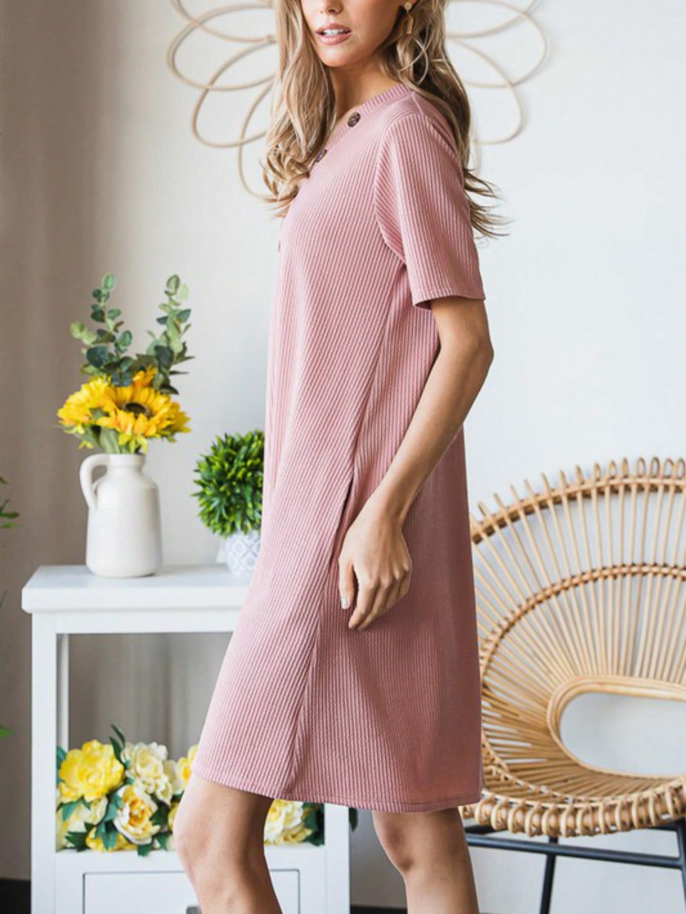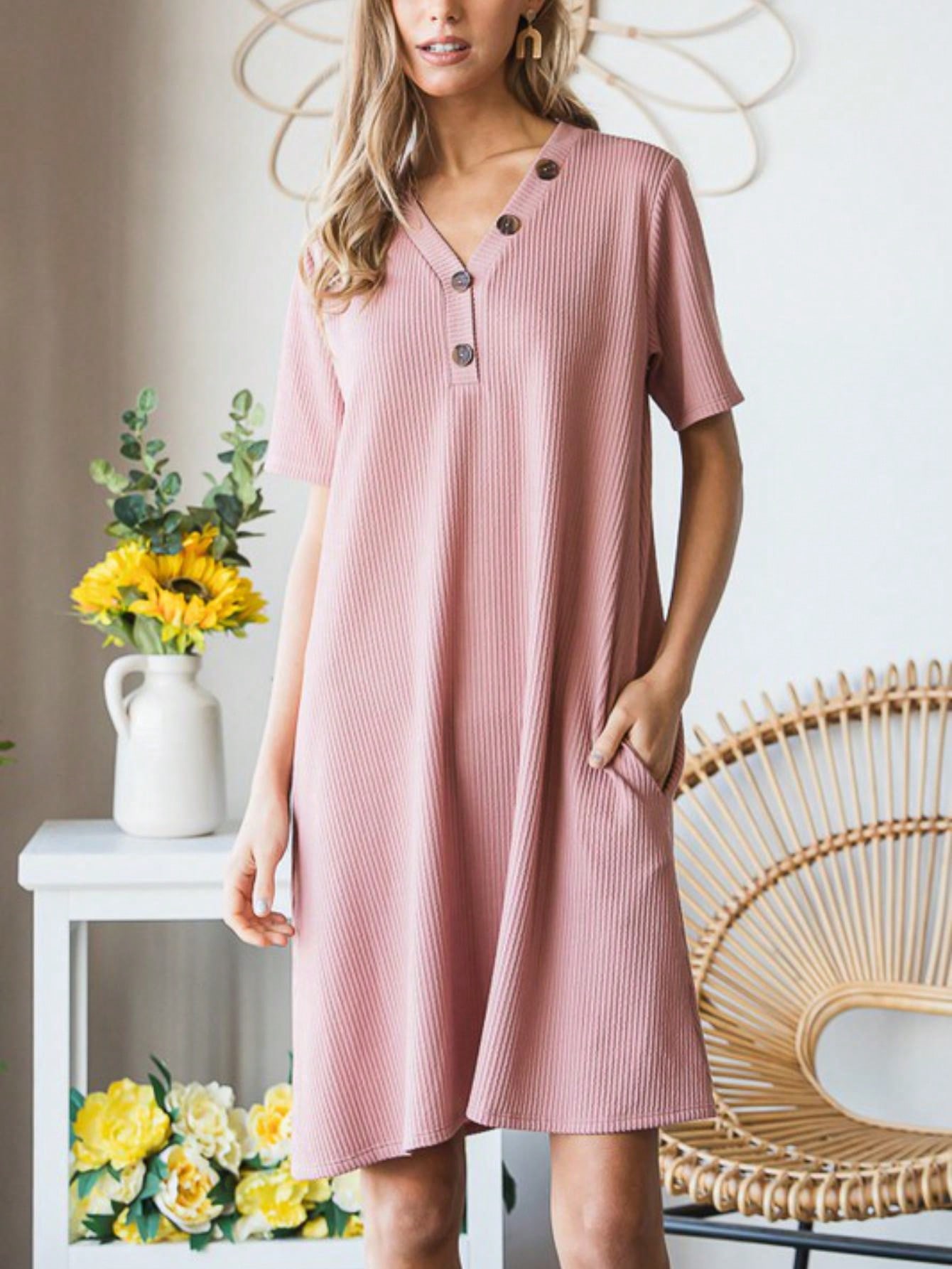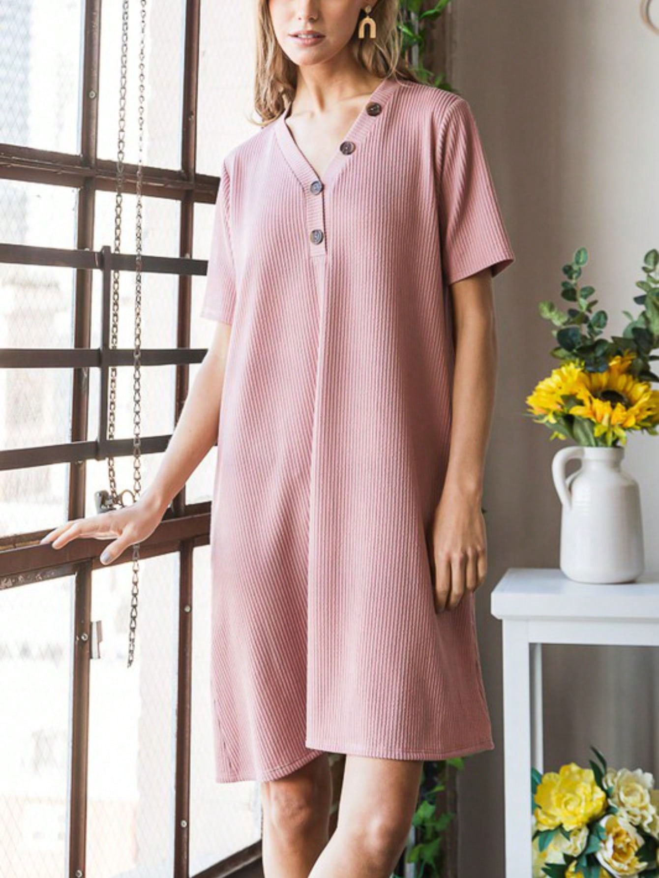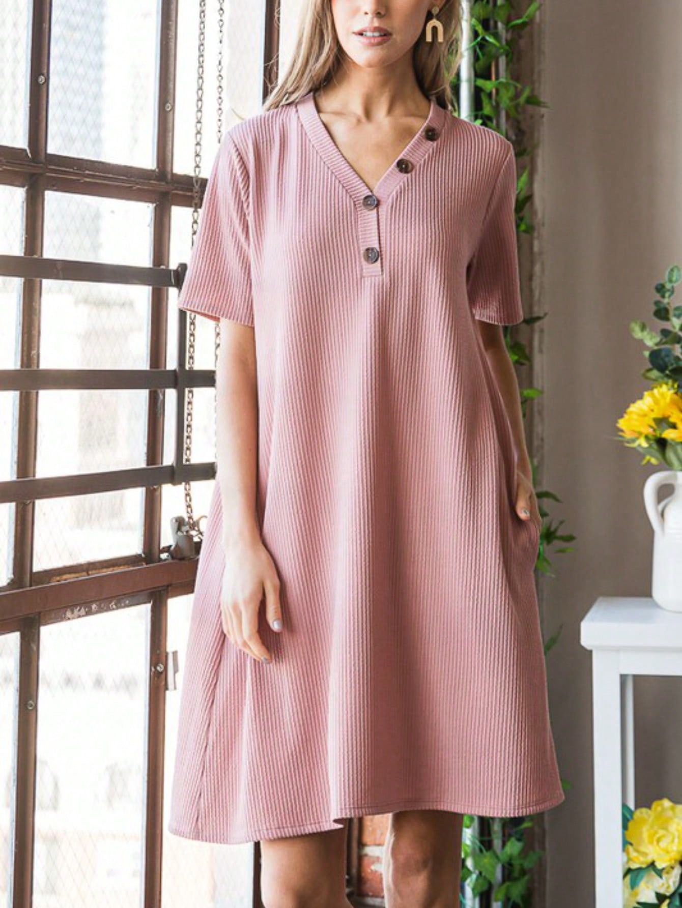 The Solid Ribbed Mini Dress with Button detailing is a chic and versatile option for any occasion. The ribbed texture adds a touch of sophistication to the dress. while the button accents create a stylish focal point. This mini dress is perfect for both casual outings and dressier events. offering a classic look that can be easily dressed up or down.