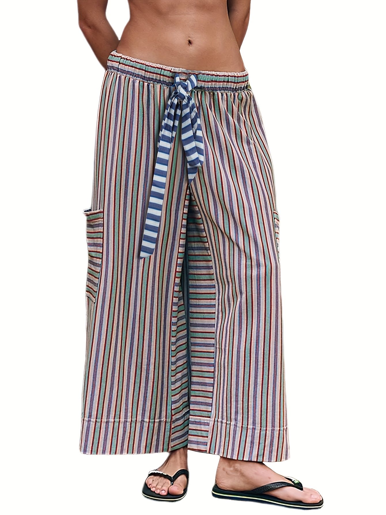Women’s Lightweight Loose Wide Leg Palazzo Pants – Casual Elastic Drawstring Waist with Dropped Pockets, Green & White Striped 100% Polyester Trousers for Springu002FSummer Outings, Spring Attire, Fashionforward Look, Comfortable Fit