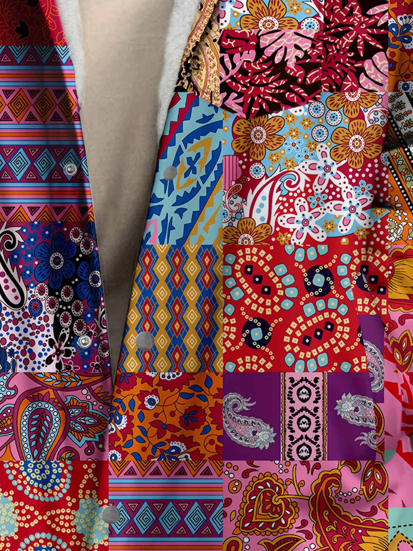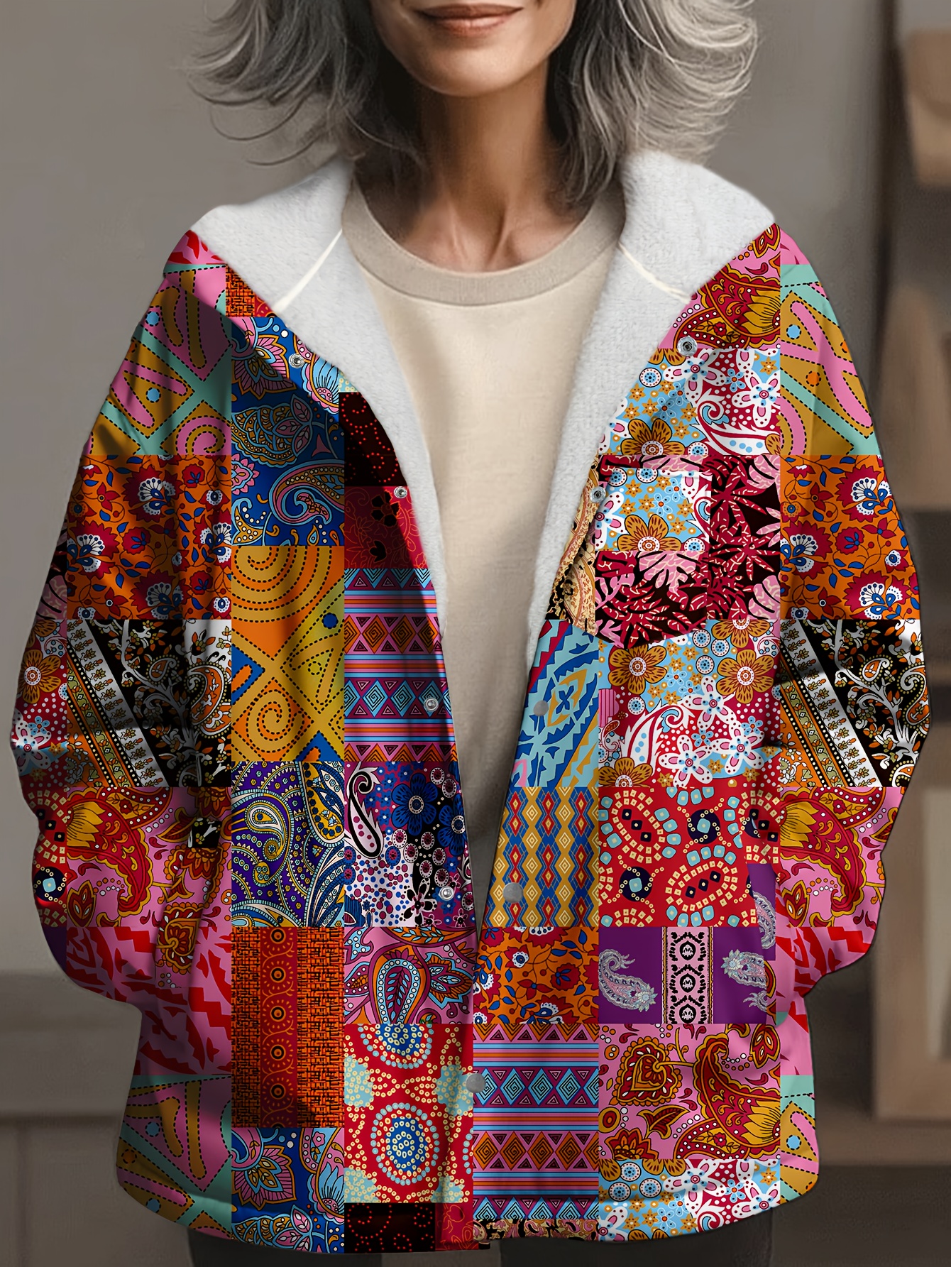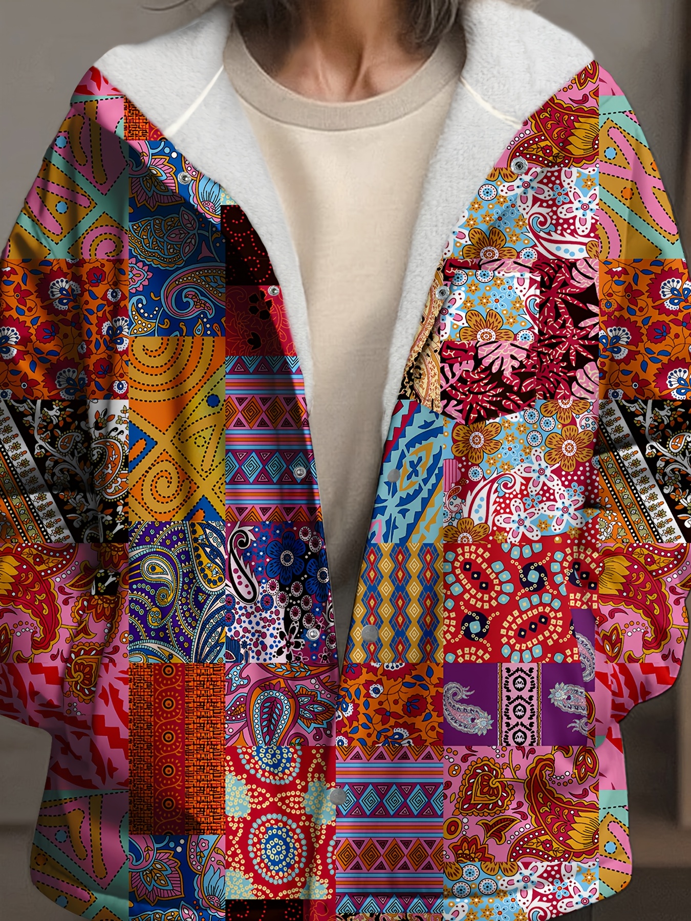 Uncategorized, WomenWomen’s Retro Ethnic Geometric Print Fleece-Lined Coat – Casual Winter Warm Long Sleeve Jacket with Zipper Closure, Machine Washable, Vibrant Colors for Autumn & Winter, Ladies Winter Coats, Cold Weather Apparel, Fuzzy Texture, Durable Comfort