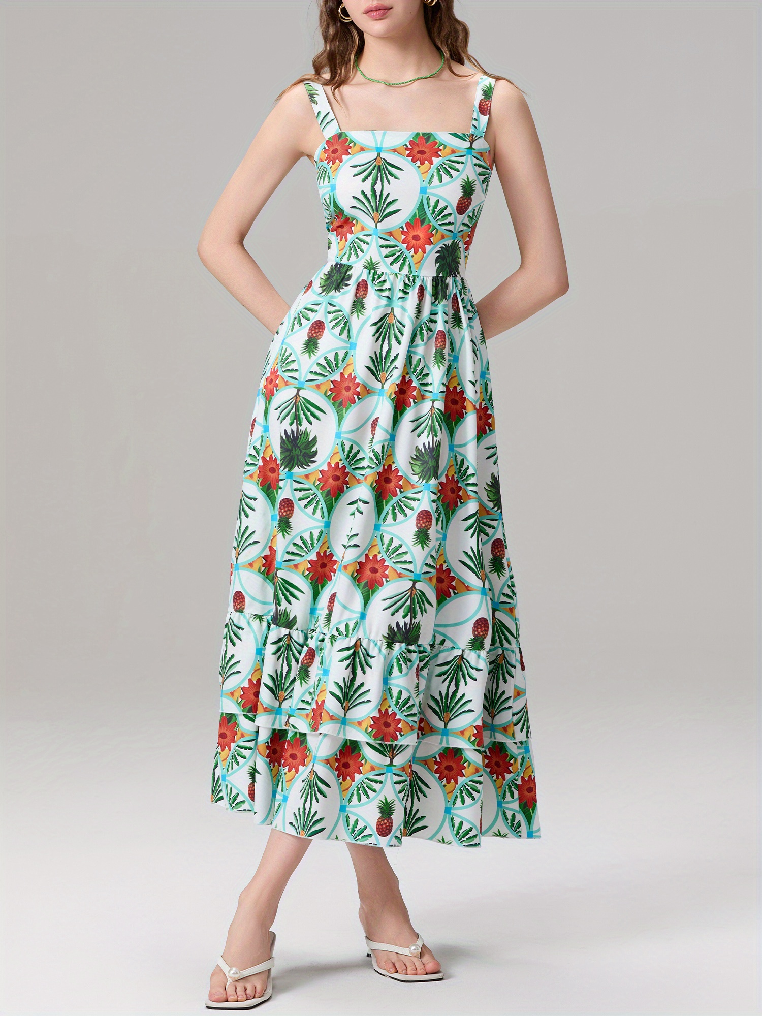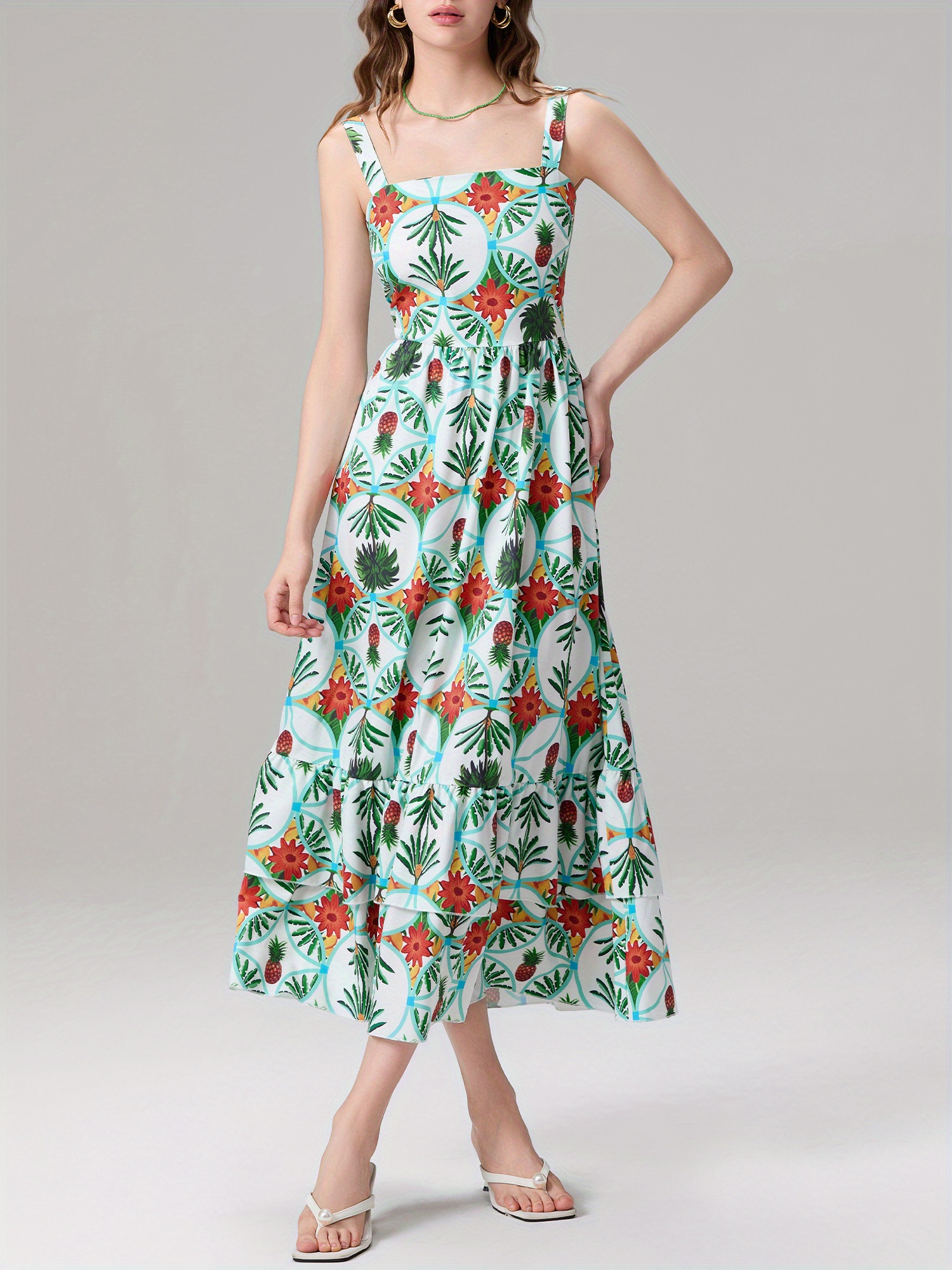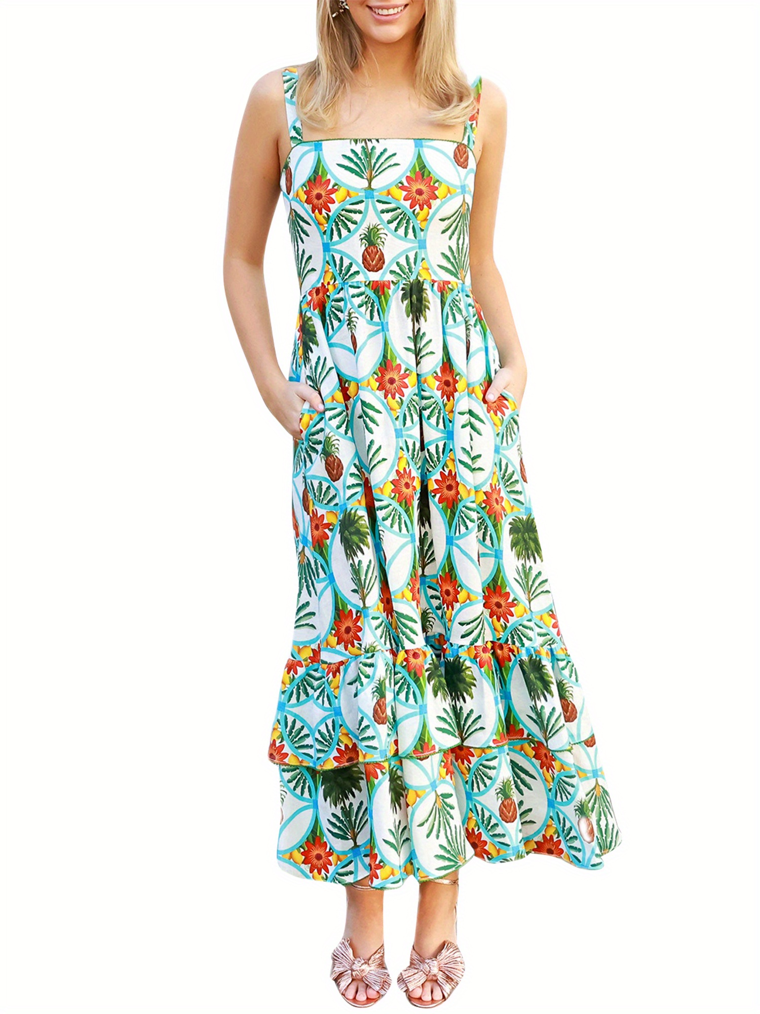 Women’s Tropical Floral Print Sleeveless A-Line Dress – Square Neck, Flowy Long Skirt, Elegant Summer Style, Light Blue with Vibrant Pineapple & Bird Design, Hand Wash or Dry Clean, Tropical Dress