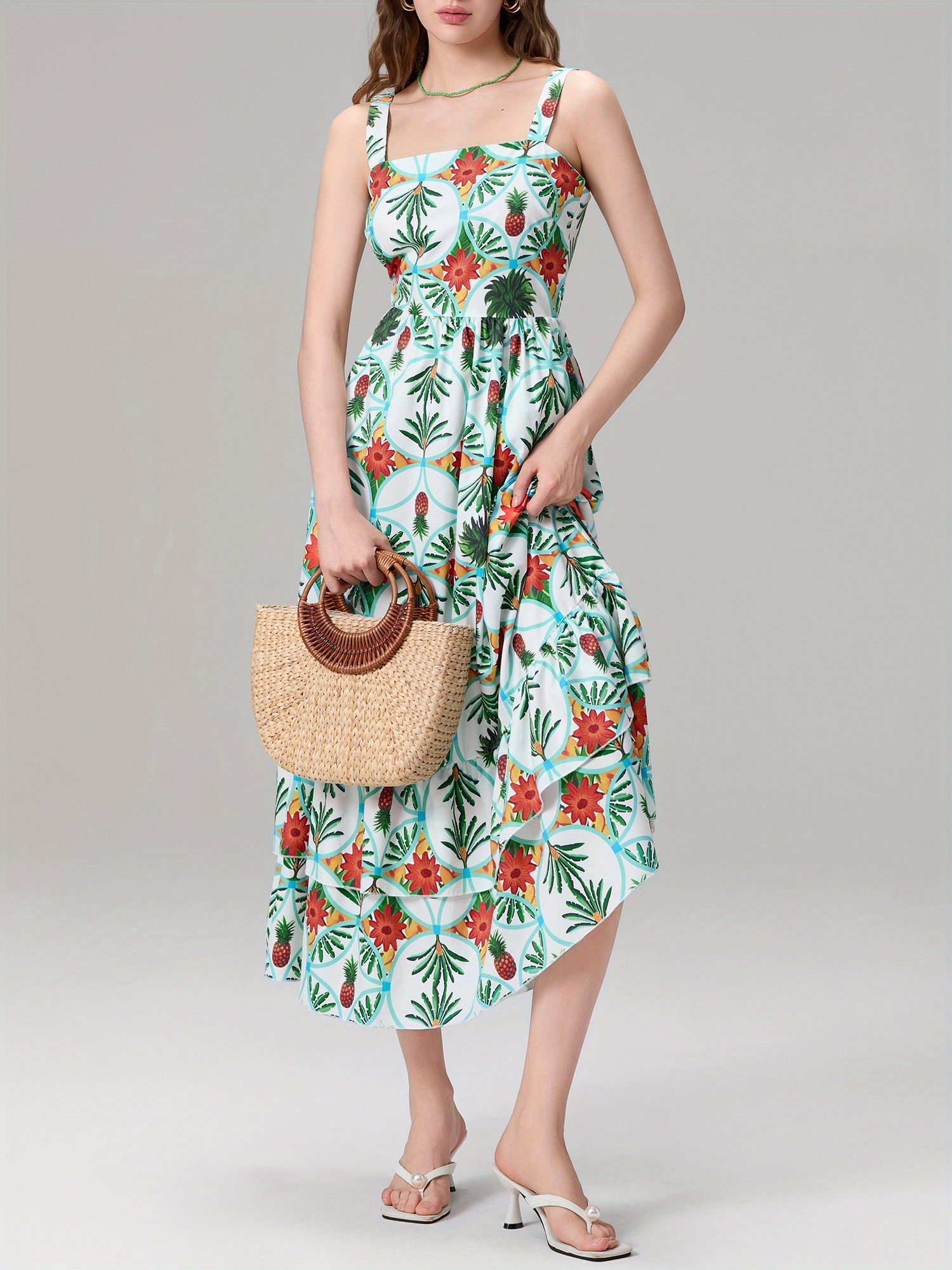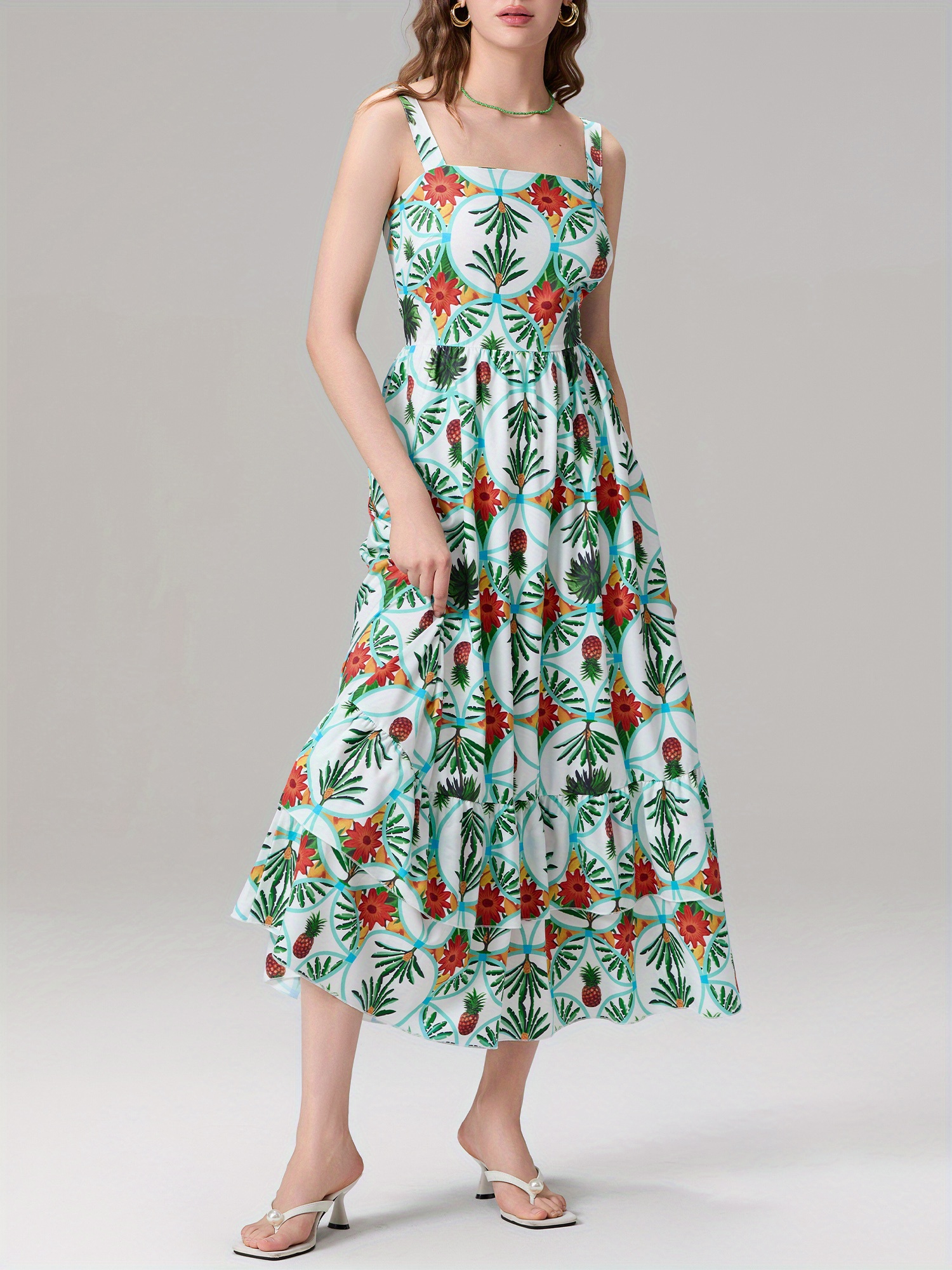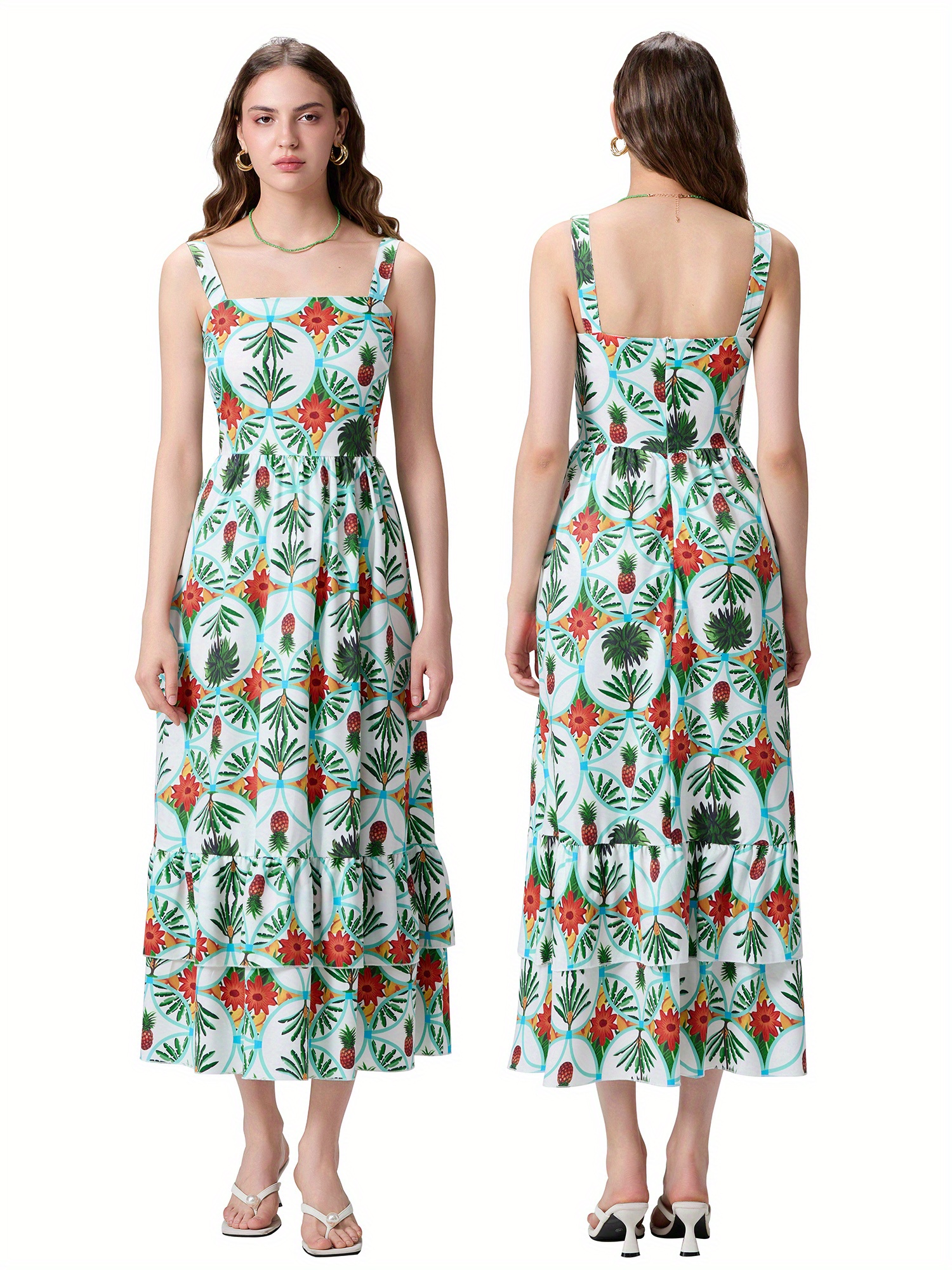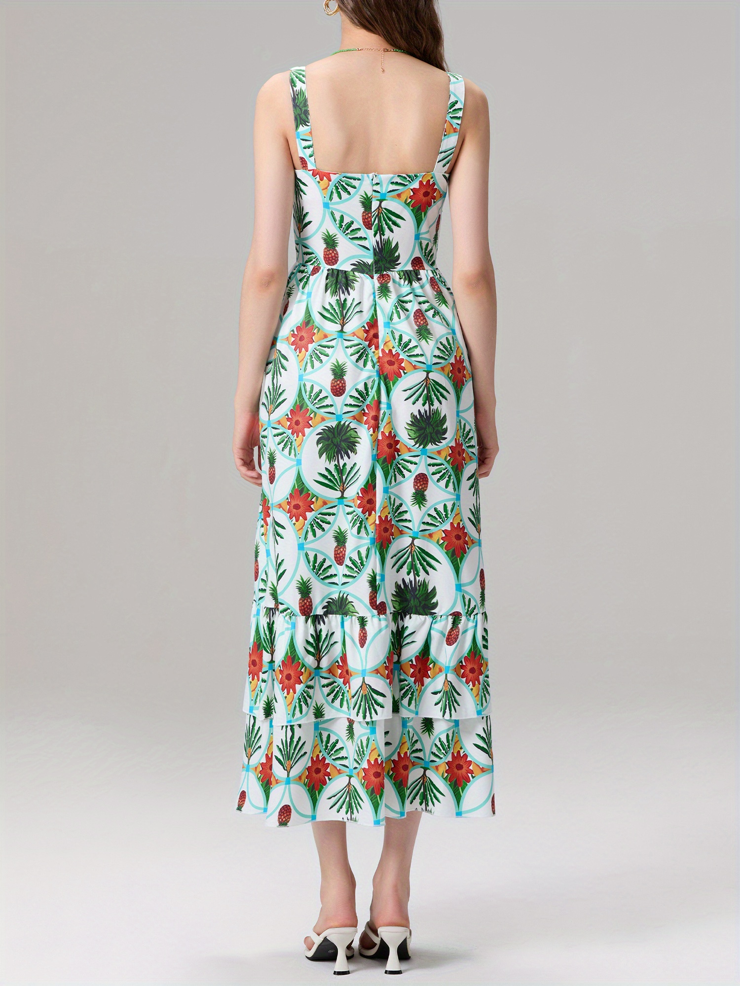 Women’s Tropical Floral Print Sleeveless A-Line Dress – Square Neck, Flowy Long Skirt, Elegant Summer Style, Light Blue with Vibrant Pineapple & Bird Design, Hand Wash or Dry Clean, Tropical Dress