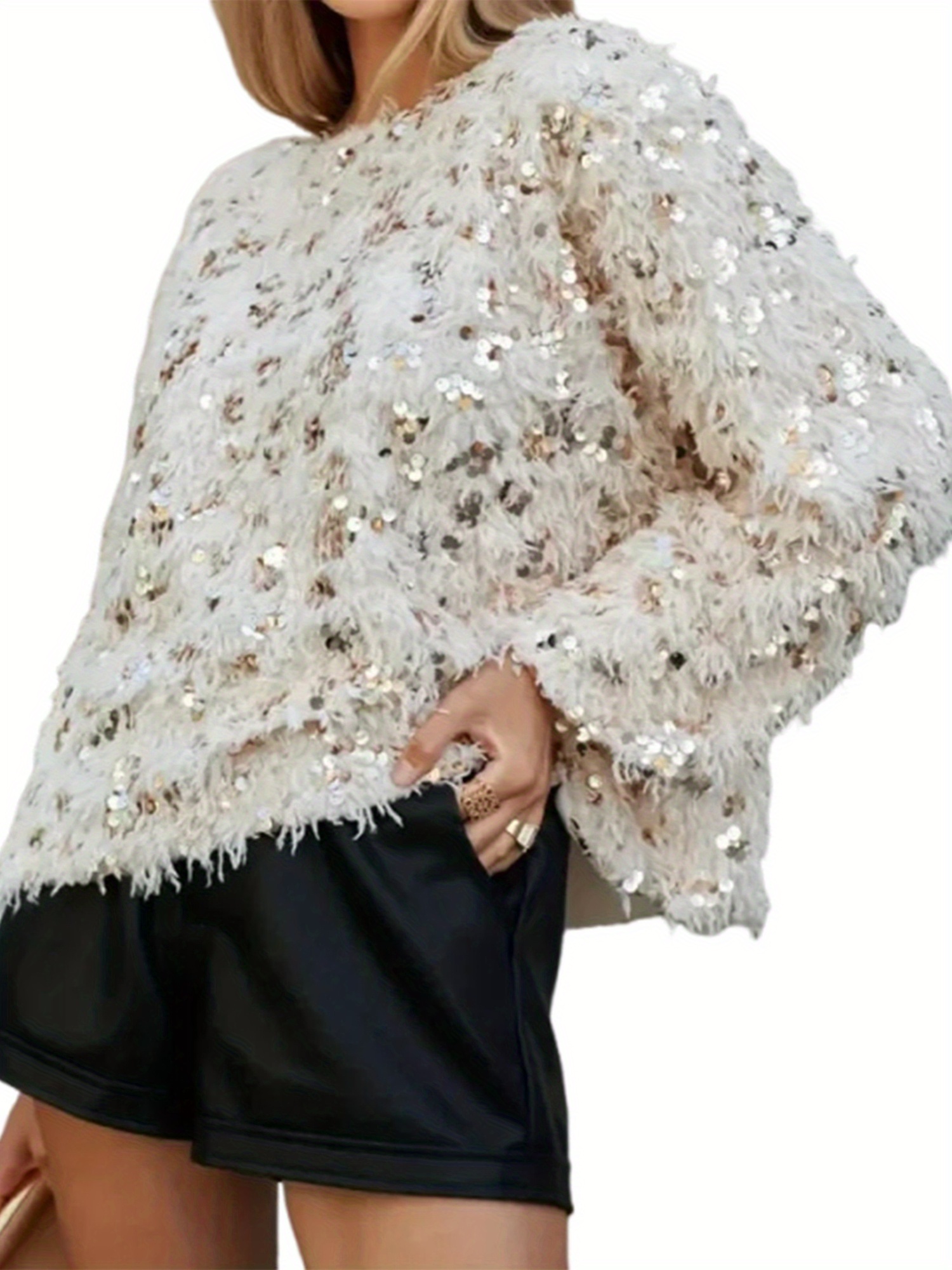 Women’s Y2K Sparkling Sequin Sweater with Tassel Hem & Fringe Sleeve Details – Loose Fit Crew Neck Long Sleeve Pullover, All-Season Party & Everyday Winter Fall Tops (Hand Washu002FDry Clean) – No-Stretch Fabric