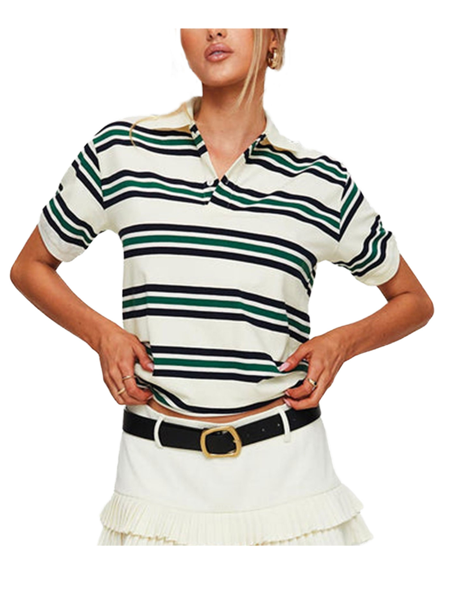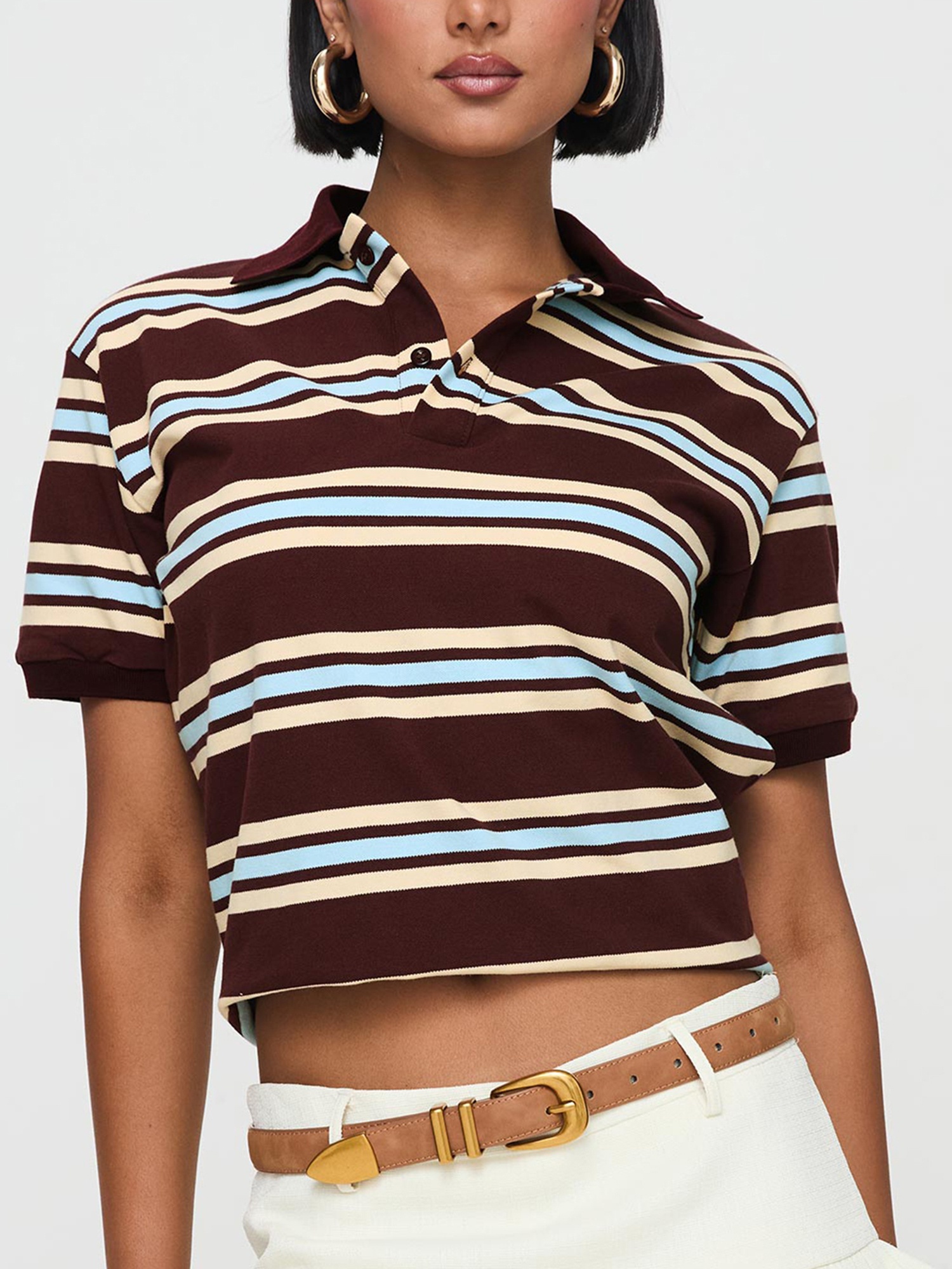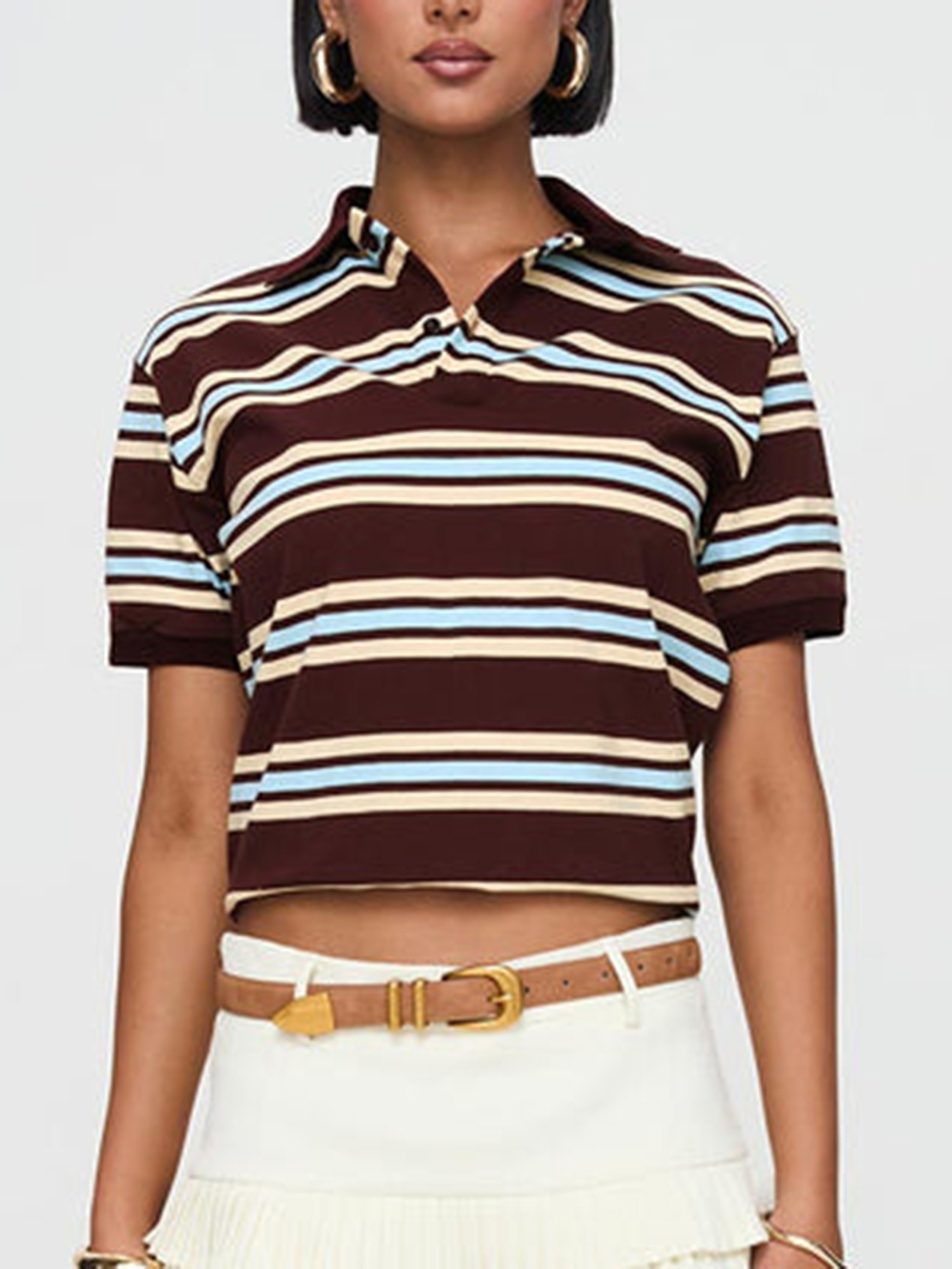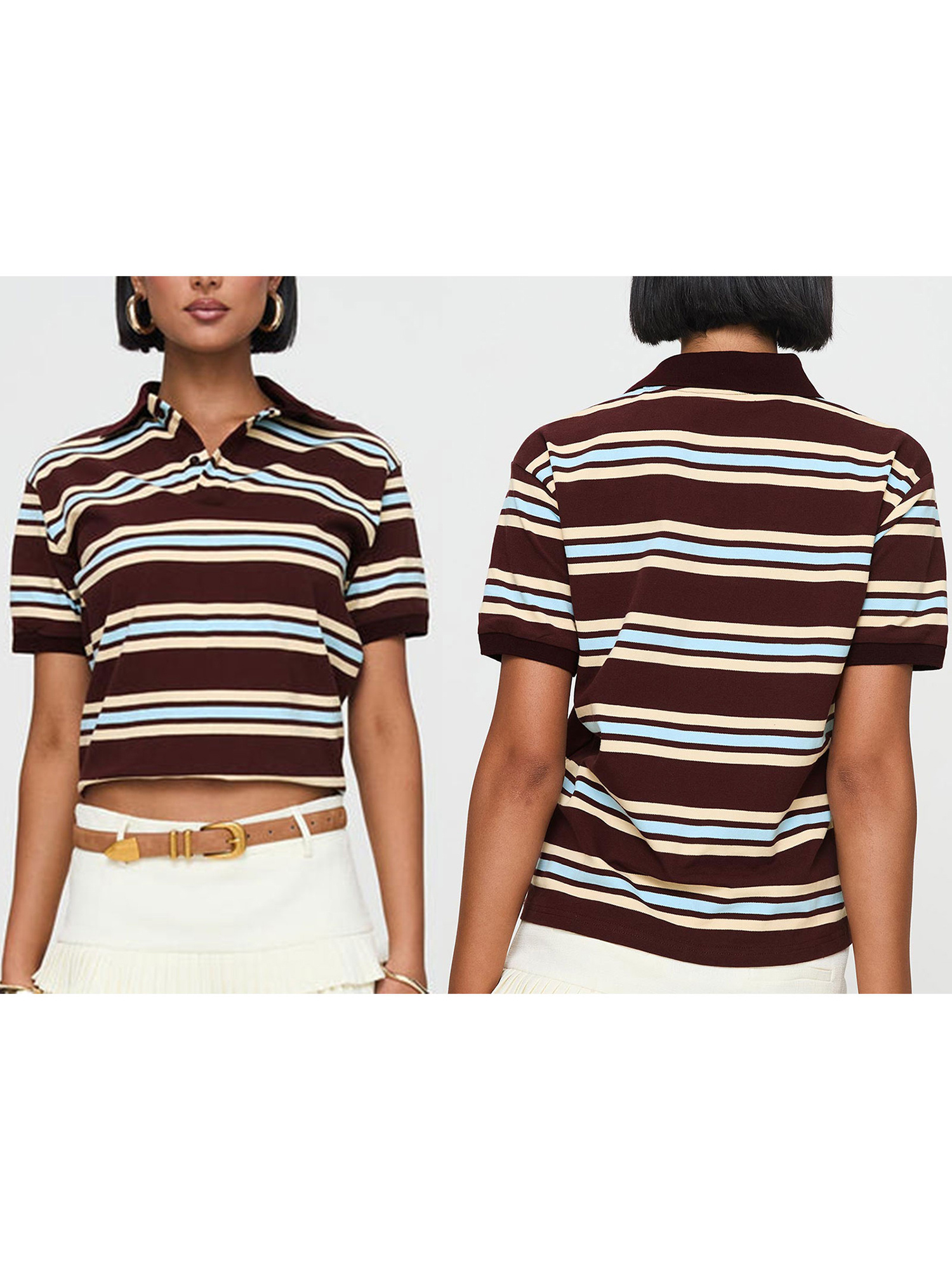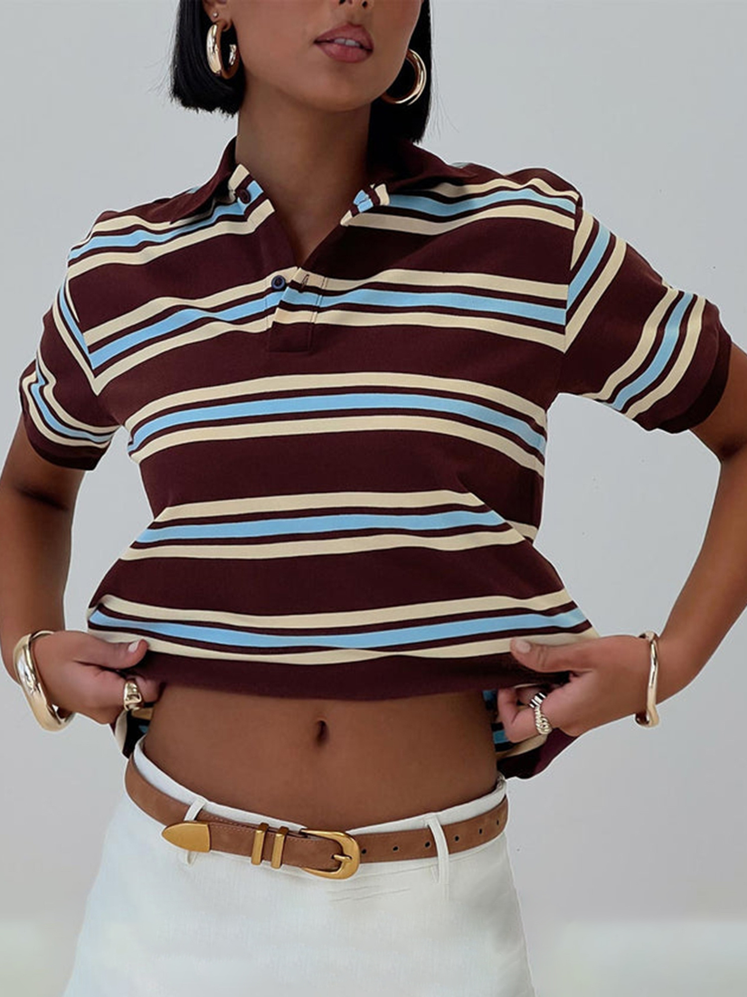 Women’s Y2K Vintage Striped Crop Top with Lapel Collar – Casual Short Sleeve Shirt in Brown & Light Blue, Non-Stretch Machine Washable Fabric for Spring Summer Fall Streetwear, Teenage Fashion, Soft Texture